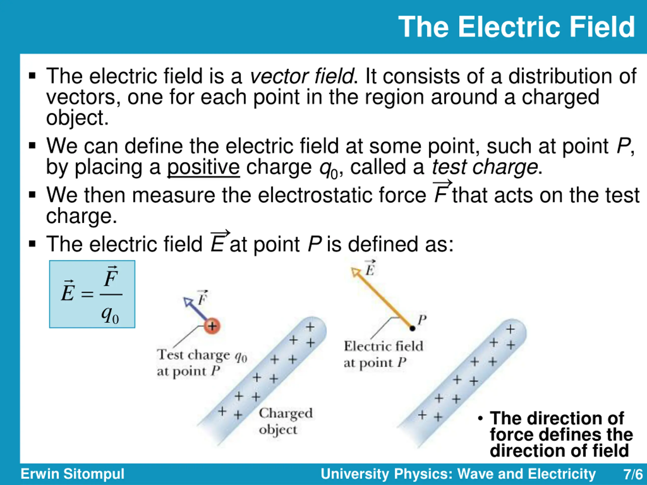 The Electric Field The positive test charge q0does not see the charged object. Instead, it feels the electric field produced by the charged object and gives response. The SI unit for the electric field is the newton per coulomb (N/C). Note: The field at point P existed both before and after the test charge was put there. Here, we assume that the presence of the test charge does not affect the charge distribution on the charged object. Erwin Sitompul University Physics: Wave and Electricity 7/7
