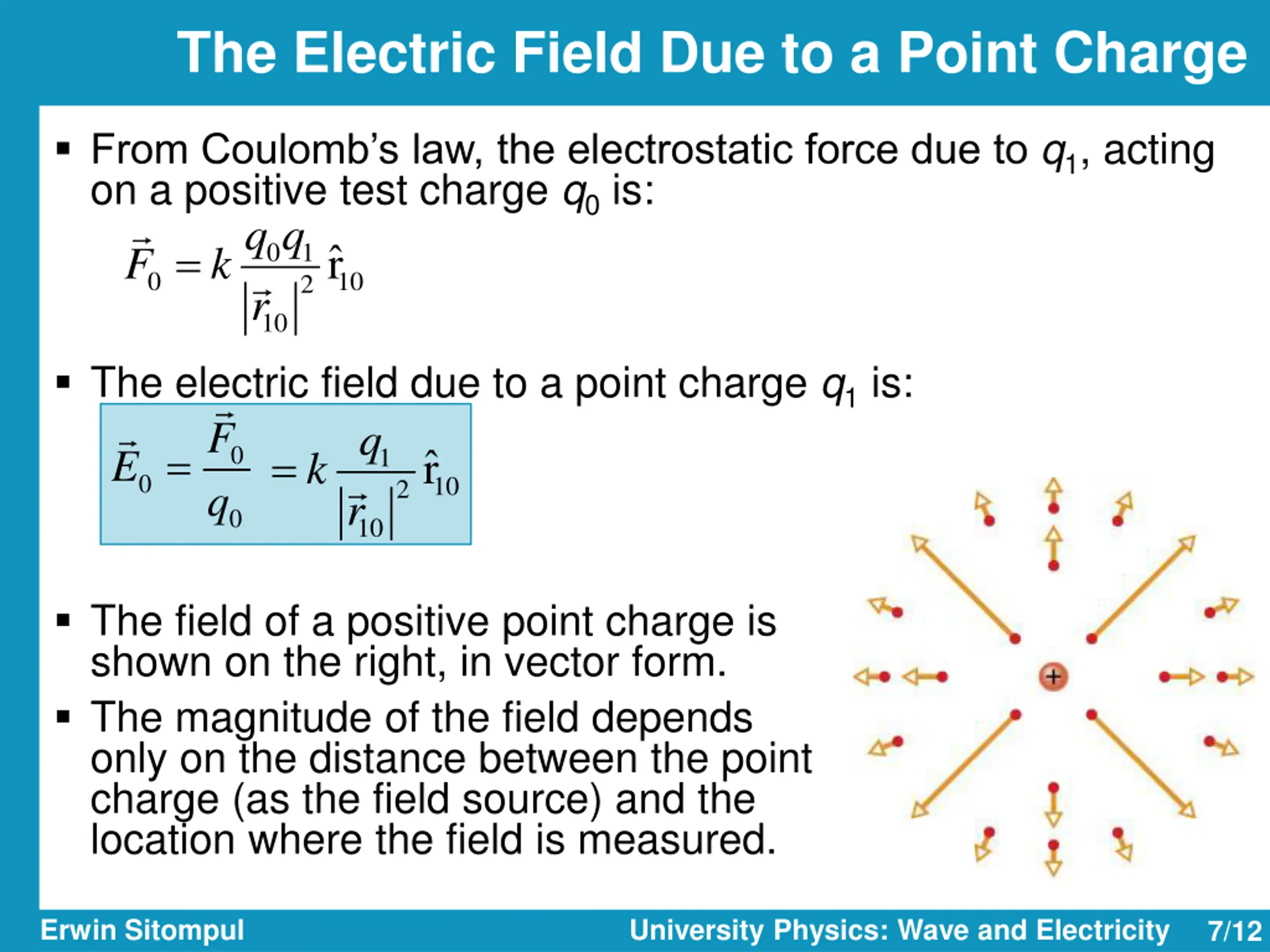 The Electric Field Due to a Point Charge From Coulomb s law, the electrostatic force due to q1, acting on a positive test charge q0 is: r F k r 0 1 q q = 0 10 2 10 The electric field due to a point charge q1 is: F q q = = 0 r E 1 k 0 10 2 10 r 0 The field of a positive point charge is shown on the right, in vector form. The magnitude of the field depends only on the distance between the point charge (as the field source) and the location where the field is measured. Erwin Sitompul University Physics: Wave and Electricity 7/12