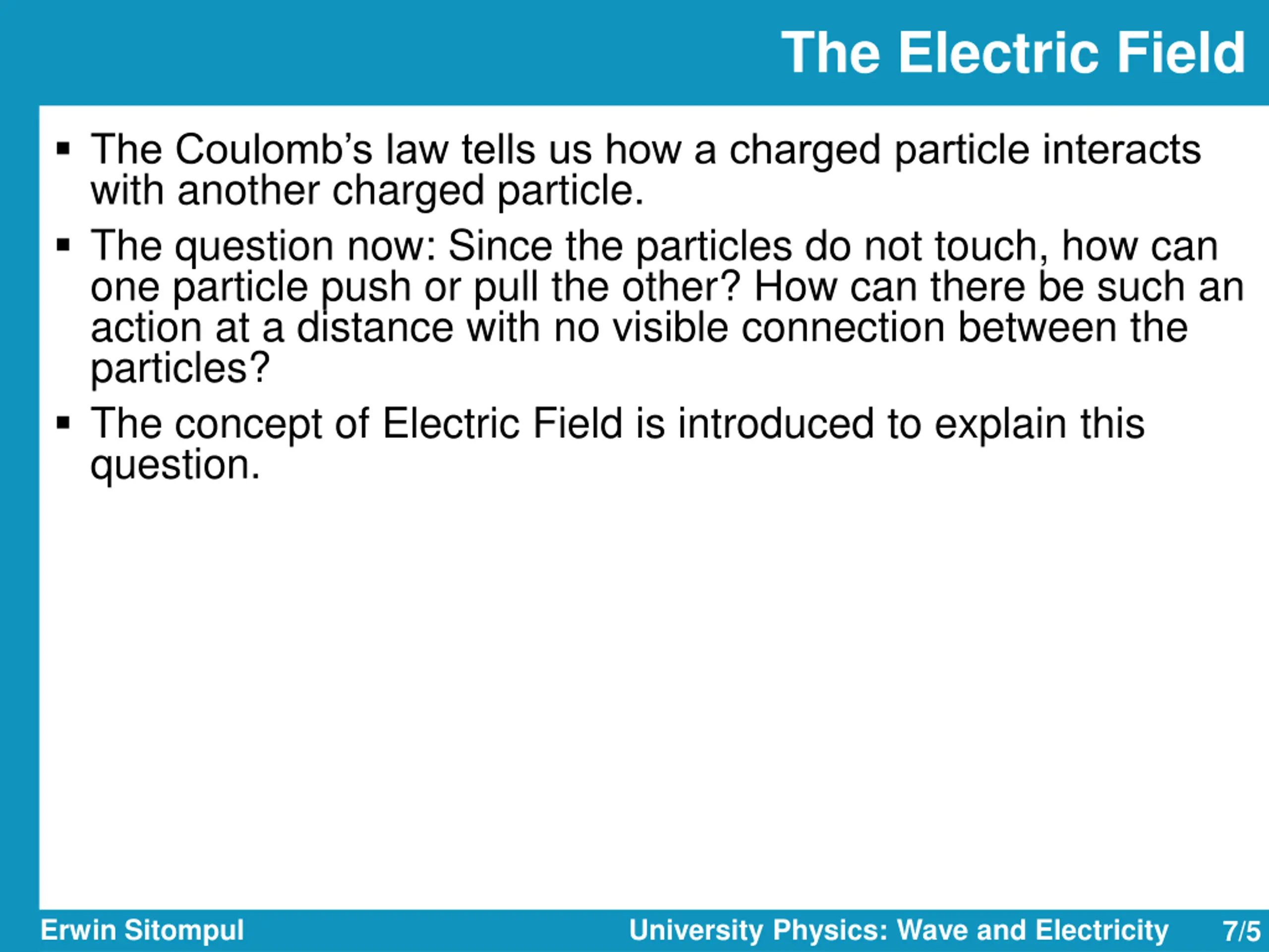 The Electric Field The Coulomb s law tells us how a charged particle interacts with another charged particle. The question now: Since the particles do not touch, how can one particle push or pull the other? How can there be such an action at a distance with no visible connection between the particles? The concept of Electric Field is introduced to explain this question. Erwin Sitompul University Physics: Wave and Electricity 7/5