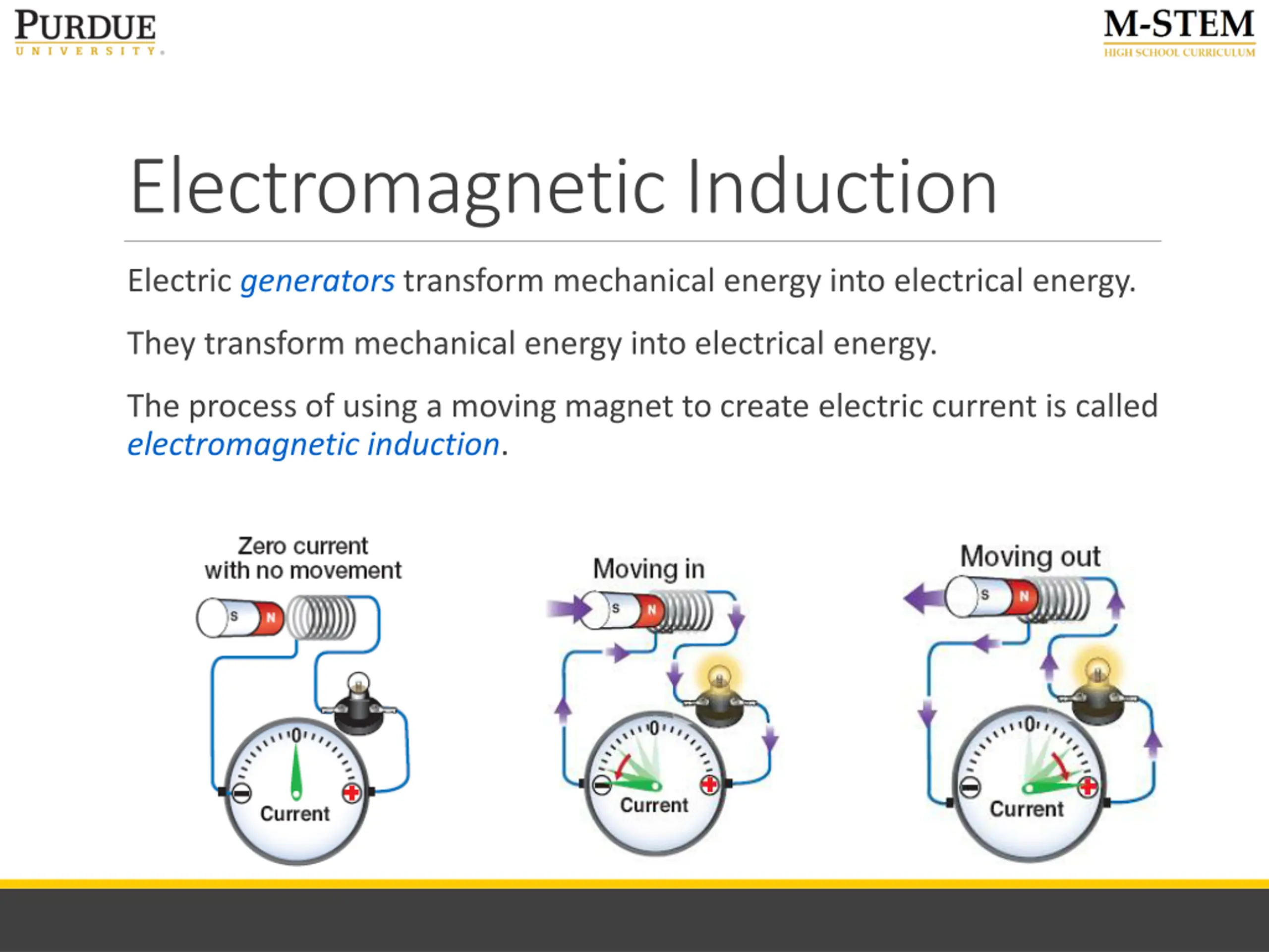 Electromagnetic Induction Electric generators transform mechanical energy into electrical energy. They transform mechanical energy into electrical energy. The process of using a moving magnet to create electric current is called electromagnetic induction.