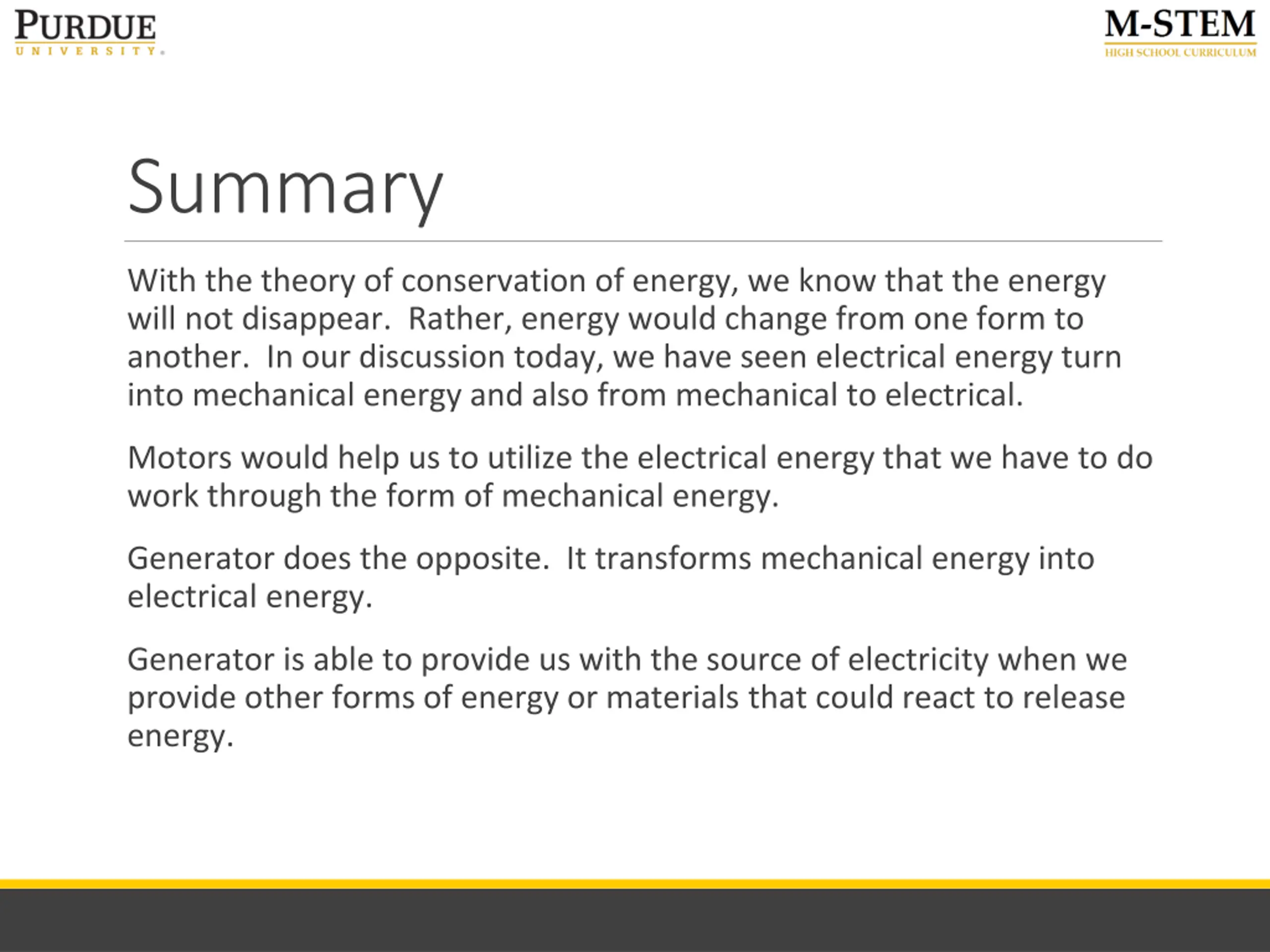 Summary With the theory of conservation of energy, we know that the energy will not disappear. Rather, energy would change from one form to another. In our discussion today, we have seen electrical energy turn into mechanical energy and also from mechanical to electrical. Motors would help us to utilize the electrical energy that we have to do work through the form of mechanical energy. Generator does the opposite. It transforms mechanical energy into electrical energy. Generator is able to provide us with the source of electricity when we provide other forms of energy or materials that could react to release energy.