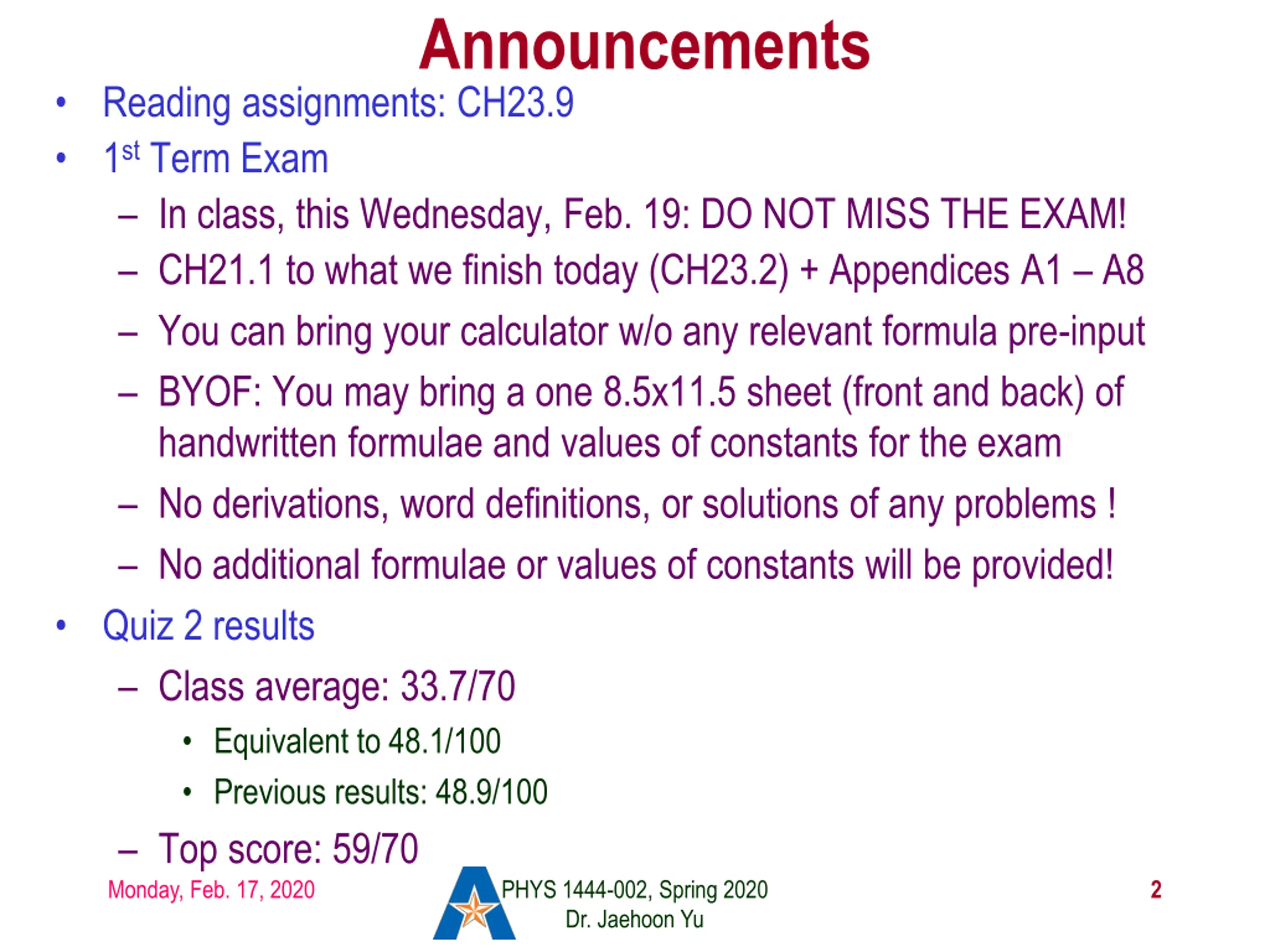 Announcements Reading assignments: CH23.9 1st Term Exam In class, this Wednesday, Feb. 19: DO NOT MISS THE EXAM! CH21.1 to what we finish today (CH23.2) + Appendices A1 A8 You can bring your calculator w/o any relevant formula pre-input BYOF: You may bring a one 8.5x11.5 sheet (front and back) of handwritten formulae and values of constants for the exam No derivations, word definitions, or solutions of any problems ! No additional formulae or values of constants will be provided! Quiz 2 results Class average: 33.7/70 Equivalent to 48.1/100 Previous results: 48.9/100 Top score: 59/70 Monday, Feb. 17, 2020 PHYS 1444-002, Spring 2020 Dr. Jaehoon Yu 2