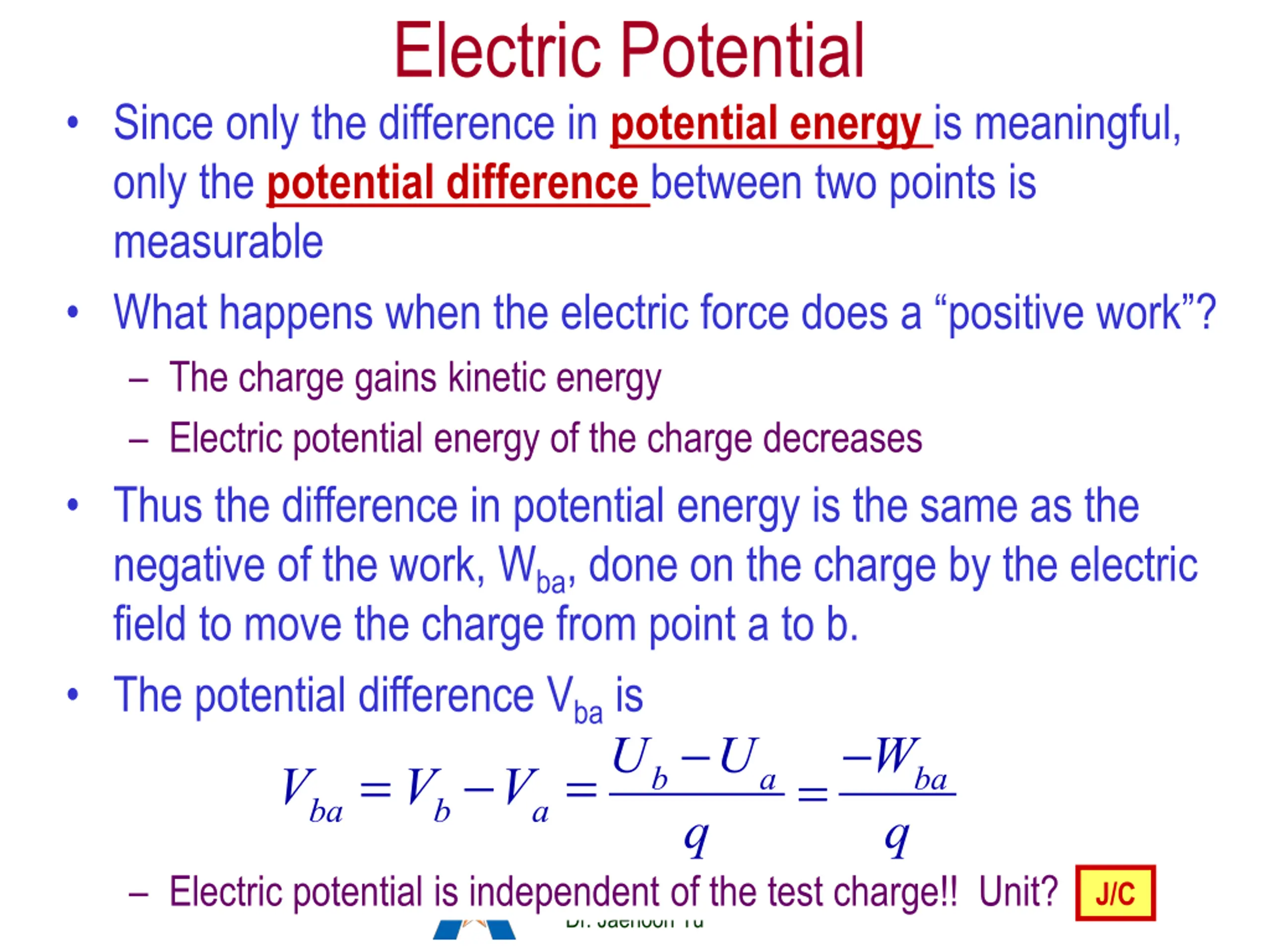Electric Potential Since only the difference in potential energy is meaningful, only the potential difference between two points is measurable What happens when the electric force does a positive work ? The charge gains kinetic energy Electric potential energy of the charge decreases Thus the difference in potential energy is the same as the negative of the work, Wba, done on the charge by the electric field to move the charge from point a to b. The potential difference Vba is Vba= Vb-Va= Ub-Ua q -Wba q = Monday, Feb. 17, 2020 Electric potential is independent of the test charge!! Unit? PHYS 1444-002, Spring 2020 Dr. Jaehoon Yu 8 J/C