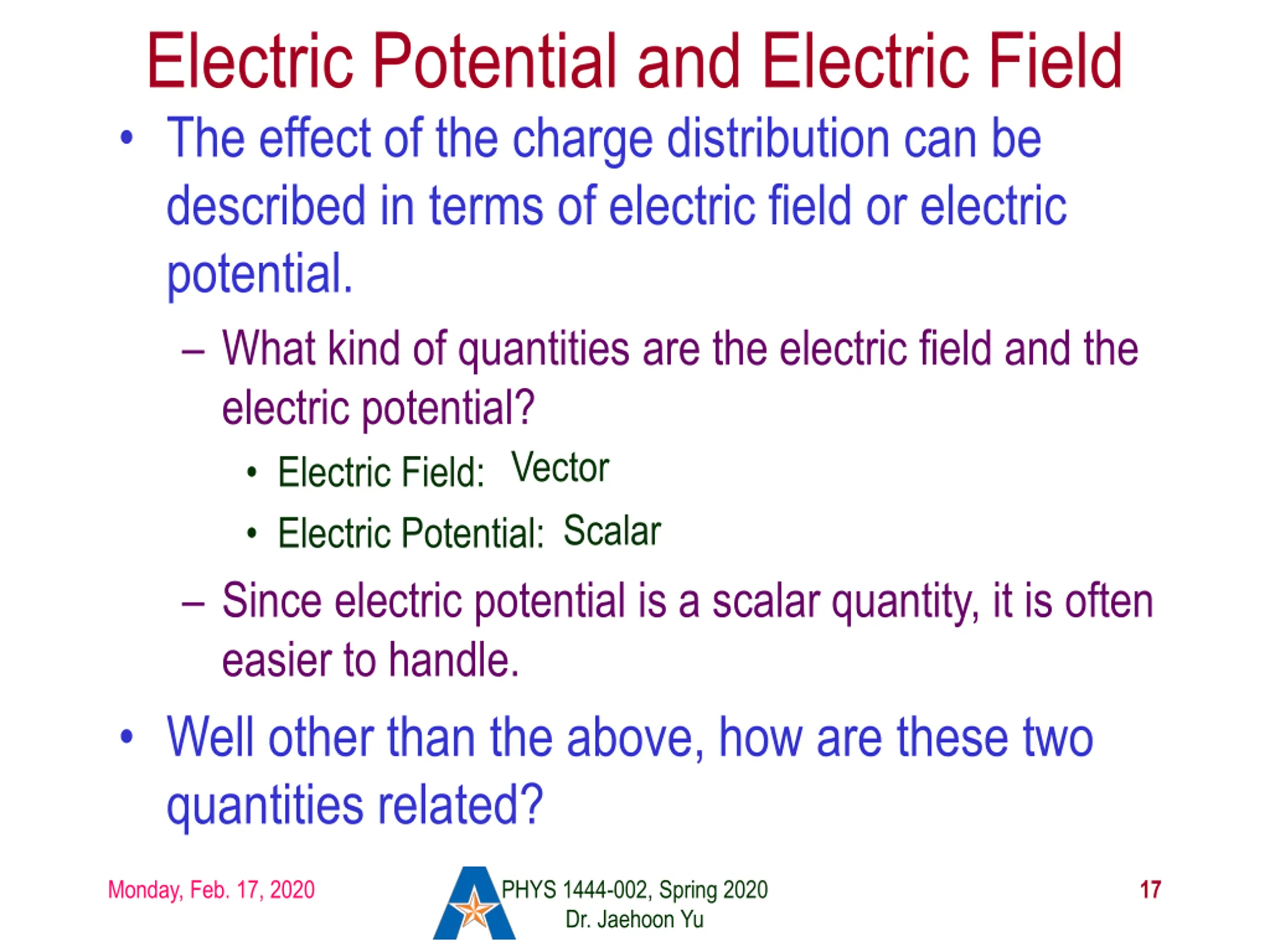 Electric Potential and Electric Field The effect of the charge distribution can be described in terms of electric field or electric potential. What kind of quantities are the electric field and the electric potential? Electric Field: Electric Potential: Since electric potential is a scalar quantity, it is often easier to handle. Well other than the above, how are these two quantities related? Vector Scalar Monday, Feb. 17, 2020 PHYS 1444-002, Spring 2020 Dr. Jaehoon Yu 17