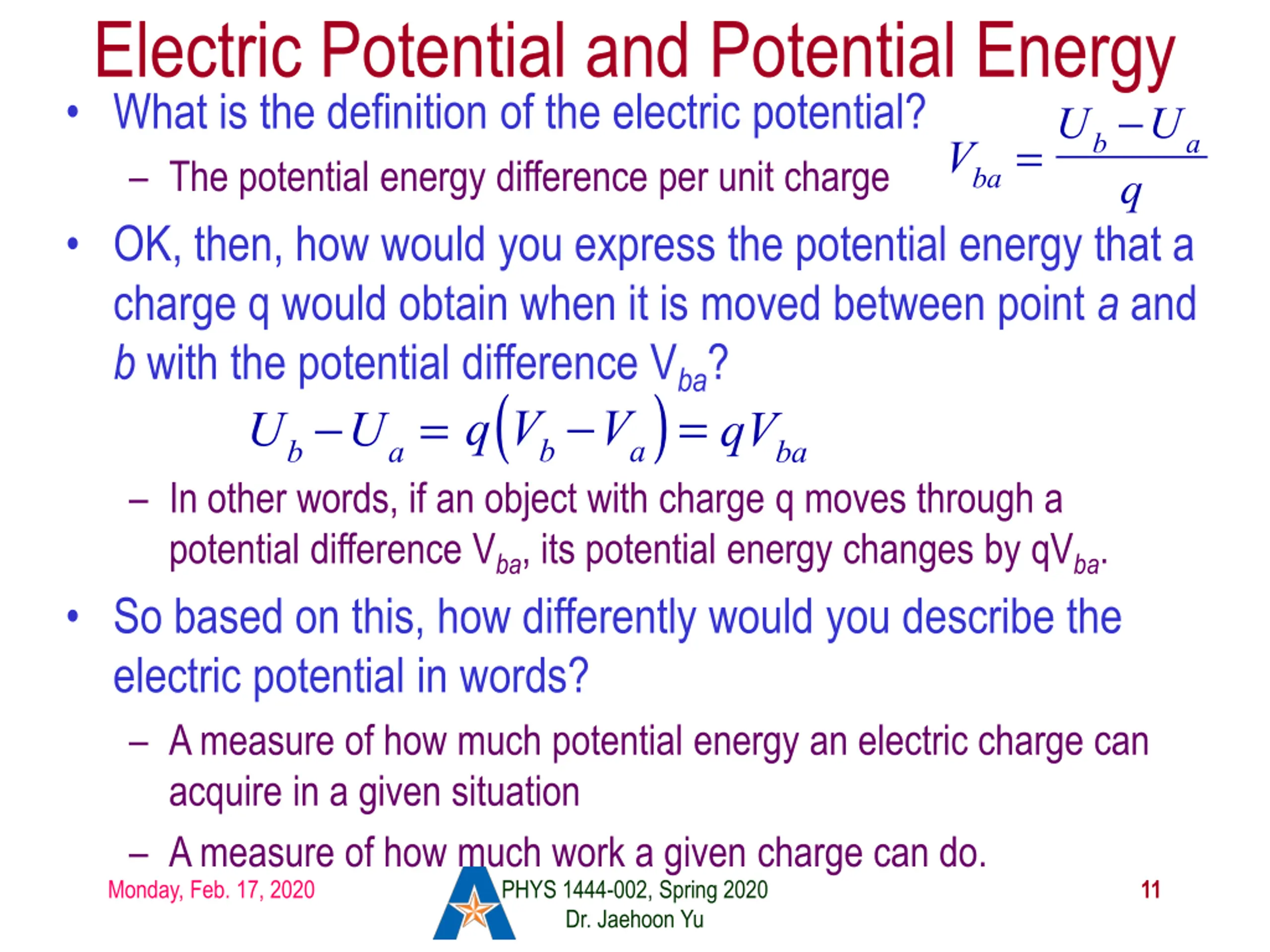 Electric Potential and Potential Energy What is the definition of the electric potential? The potential energy difference per unit charge OK, then, how would you express the potential energy that a charge q would obtain when it is moved between point a and b with the potential difference Vba? Ub-Ua= q Vb-Va Ub-Ua q Vba= ( )= qVba In other words, if an object with charge q moves through a potential difference Vba, its potential energy changes by qVba. So based on this, how differently would you describe the electric potential in words? A measure of how much potential energy an electric charge can acquire in a given situation A measure of how much work a given charge can do. Monday, Feb. 17, 2020 PHYS 1444-002, Spring 2020 Dr. Jaehoon Yu 11