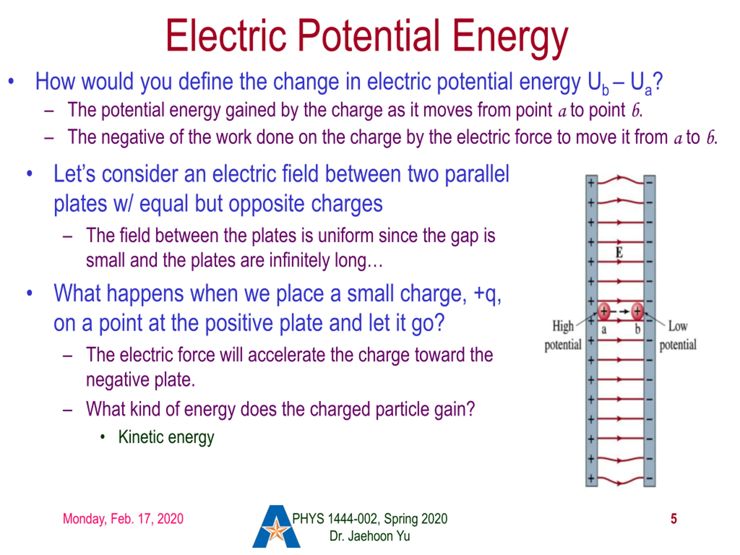 Electric Potential Energy How would you define the change in electric potential energy Ub Ua? The potential energy gained by the charge as it moves from point a to point b. The negative of the work done on the charge by the electric force to move it from a to b. Let s consider an electric field between two parallel plates w/ equal but opposite charges The field between the plates is uniform since the gap is small and the plates are infinitely long What happens when we place a small charge, +q, on a point at the positive plate and let it go? The electric force will accelerate the charge toward the negative plate. What kind of energy does the charged particle gain? Kinetic energy Monday, Feb. 17, 2020 PHYS 1444-002, Spring 2020 Dr. Jaehoon Yu 5