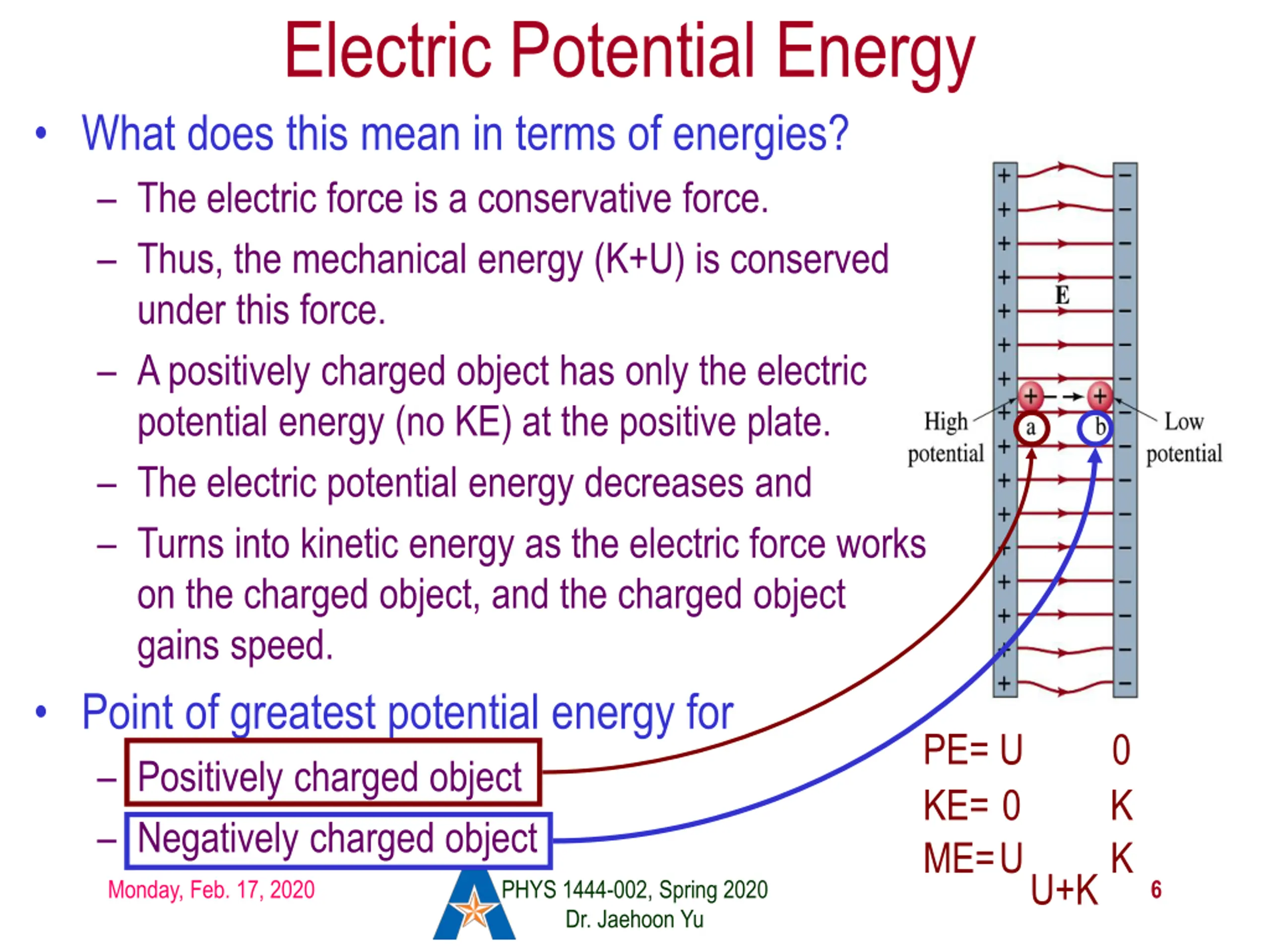 Electric Potential Energy What does this mean in terms of energies? The electric force is a conservative force. Thus, the mechanical energy (K+U) is conserved under this force. A positively charged object has only the electric potential energy (no KE) at the positive plate. The electric potential energy decreases and Turns into kinetic energy as the electric force works on the charged object, and the charged object gains speed. Point of greatest potential energy for Positively charged object Negatively charged object PE= KE= ME= U 0 UU+KK 0 K Monday, Feb. 17, 2020 PHYS 1444-002, Spring 2020 Dr. Jaehoon Yu 6
