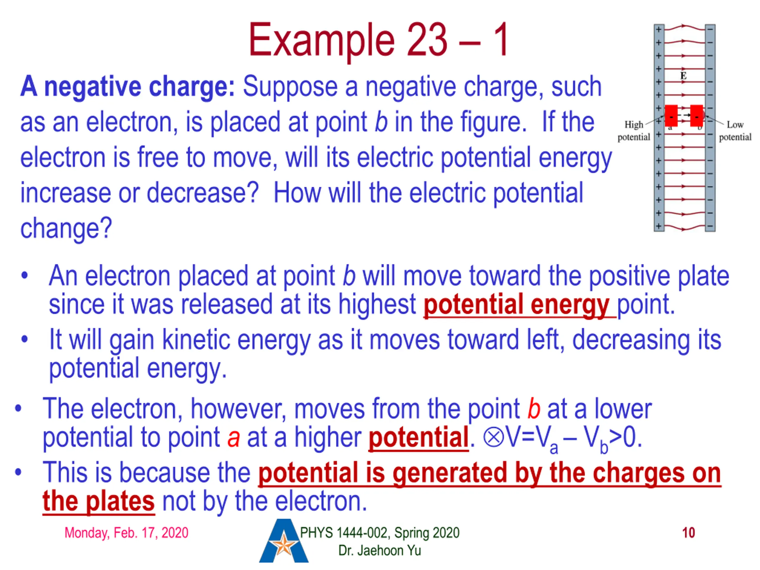 Example 23 1 A negative charge: Suppose a negative charge, such as an electron, is placed at point b in the figure. If the electron is free to move, will its electric potential energy increase or decrease? How will the electric potential change? An electron placed at point b will move toward the positive plate since it was released at its highest potential energy point. It will gain kinetic energy as it moves toward left, decreasing its potential energy. The electron, however, moves from the point b at a lower potential to point a at a higher potential. V=Va Vb>0. This is because the potential is generated by the charges on the plates not by the electron. - - Monday, Feb. 17, 2020 PHYS 1444-002, Spring 2020 Dr. Jaehoon Yu 10