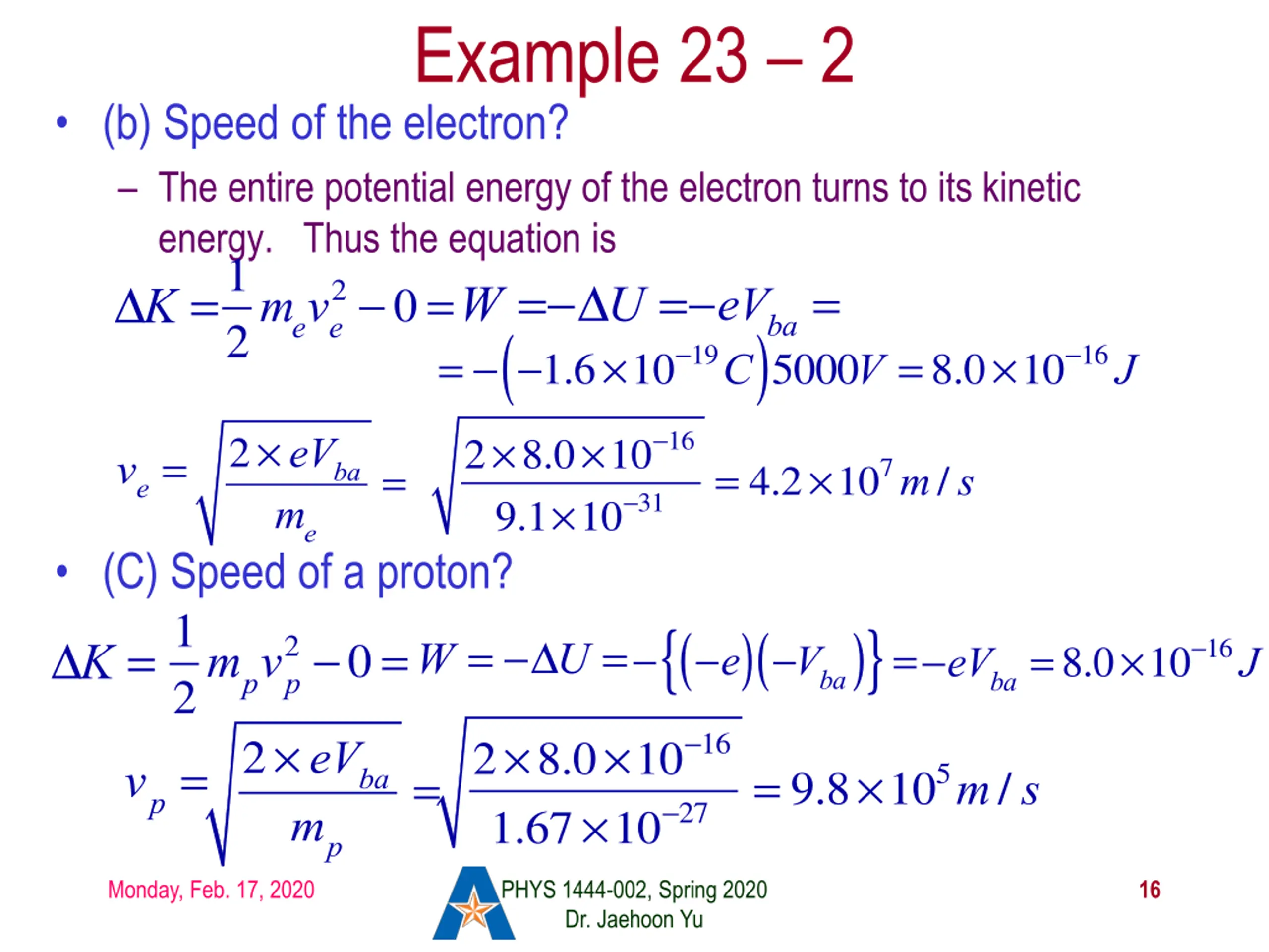 Example 23 2 Electrons in TV tube: Suppose an electron in the picture tube of a television set is accelerated from rest through a potential difference Vba=+5000V. (a) What is the change in potential energy of the electron? (b) What is the speed of the electron (m=9.1x10-31kg) as a result of this acceleration? (c) Repeat for a proton (m=1.67x10-27kg) that accelerates through a potential difference of Vba= - 5000V. (a) What is the charge of an electron? e= -1.6 10-19C So what is the change of its potential energy? ( )+5000V ( )= -8.0 10-16J DU = qVba= eVba= -1.6 10-19C Monday, Feb. 17, 2020 PHYS 1444-002, Spring 2020 Dr. Jaehoon Yu 15