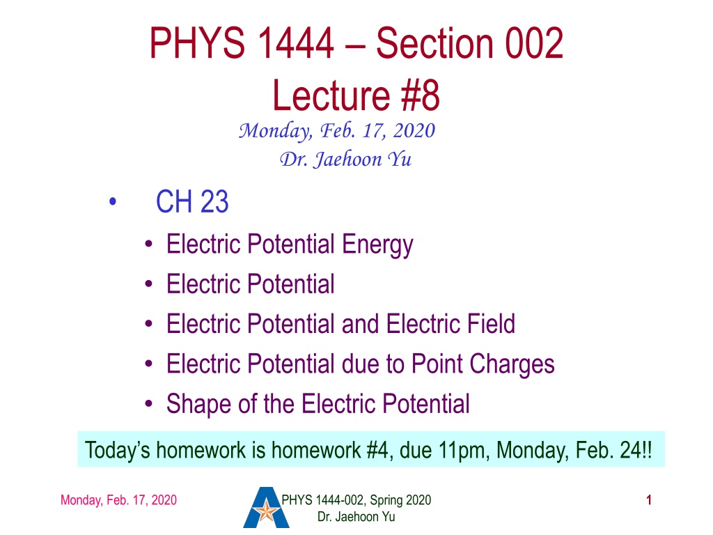 PHYS 1444 Section 002 Lecture #8 Monday, Feb. 17, 2020 Dr. Jaehoon Yu CH 23 Electric Potential Energy Electric Potential Electric Potential and Electric Field Electric Potential due to Point Charges Shape of the Electric Potential Today s homework is homework #4, due 11pm, Monday, Feb. 24!! Monday, Feb. 17, 2020 PHYS 1444-002, Spring 2020 Dr. Jaehoon Yu 1