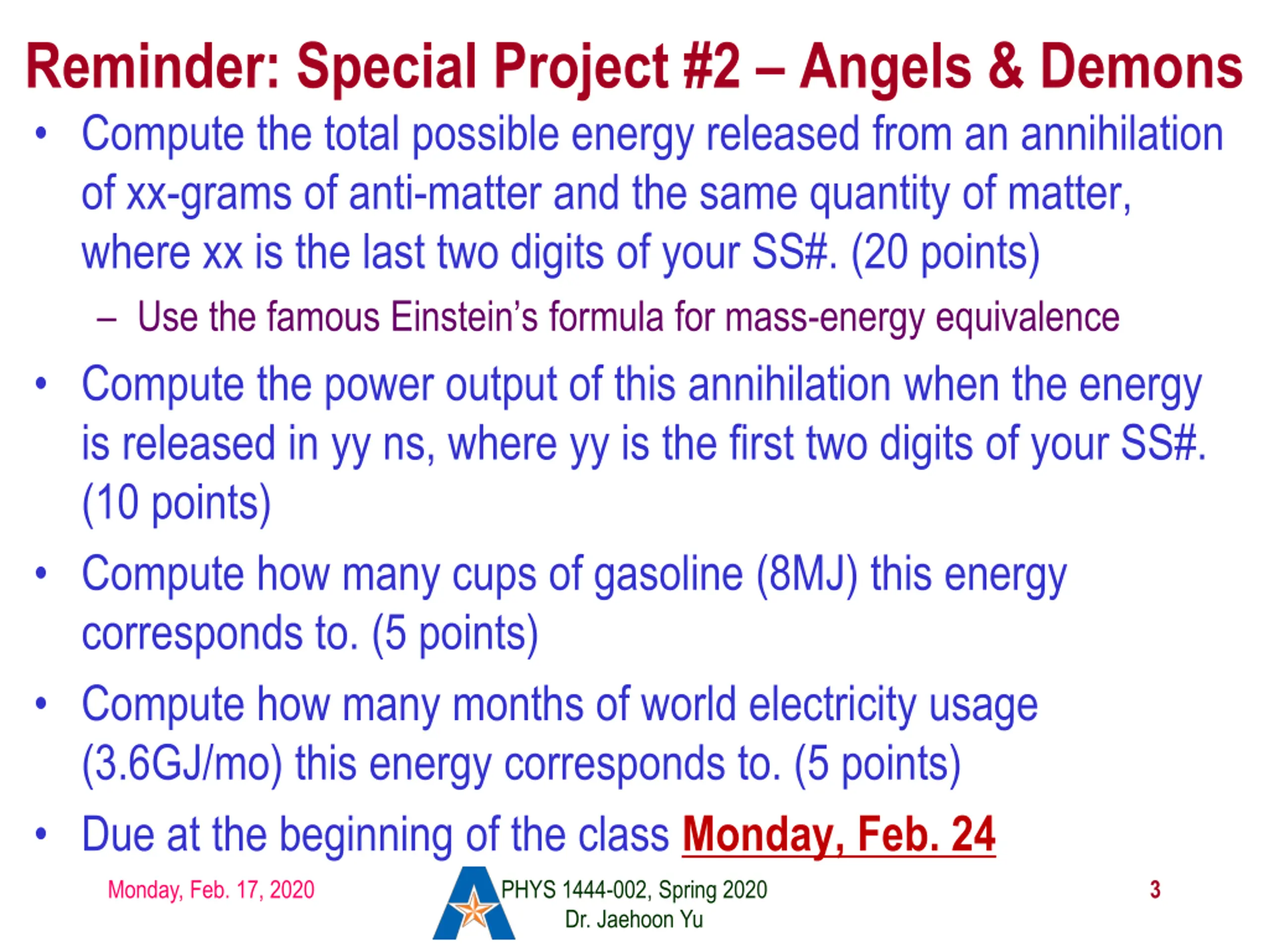Reminder: Special Project #2 Angels & Demons Compute the total possible energy released from an annihilation of xx-grams of anti-matter and the same quantity of matter, where xx is the last two digits of your SS#. (20 points) Use the famous Einstein s formula for mass-energy equivalence Compute the power output of this annihilation when the energy is released in yy ns, where yy is the first two digits of your SS#. (10 points) Compute how many cups of gasoline (8MJ) this energy corresponds to. (5 points) Compute how many months of world electricity usage (3.6GJ/mo) this energy corresponds to. (5 points) Due at the beginning of the class Monday, Feb. 24 Monday, Feb. 17, 2020 PHYS 1444-002, Spring 2020 Dr. Jaehoon Yu 3