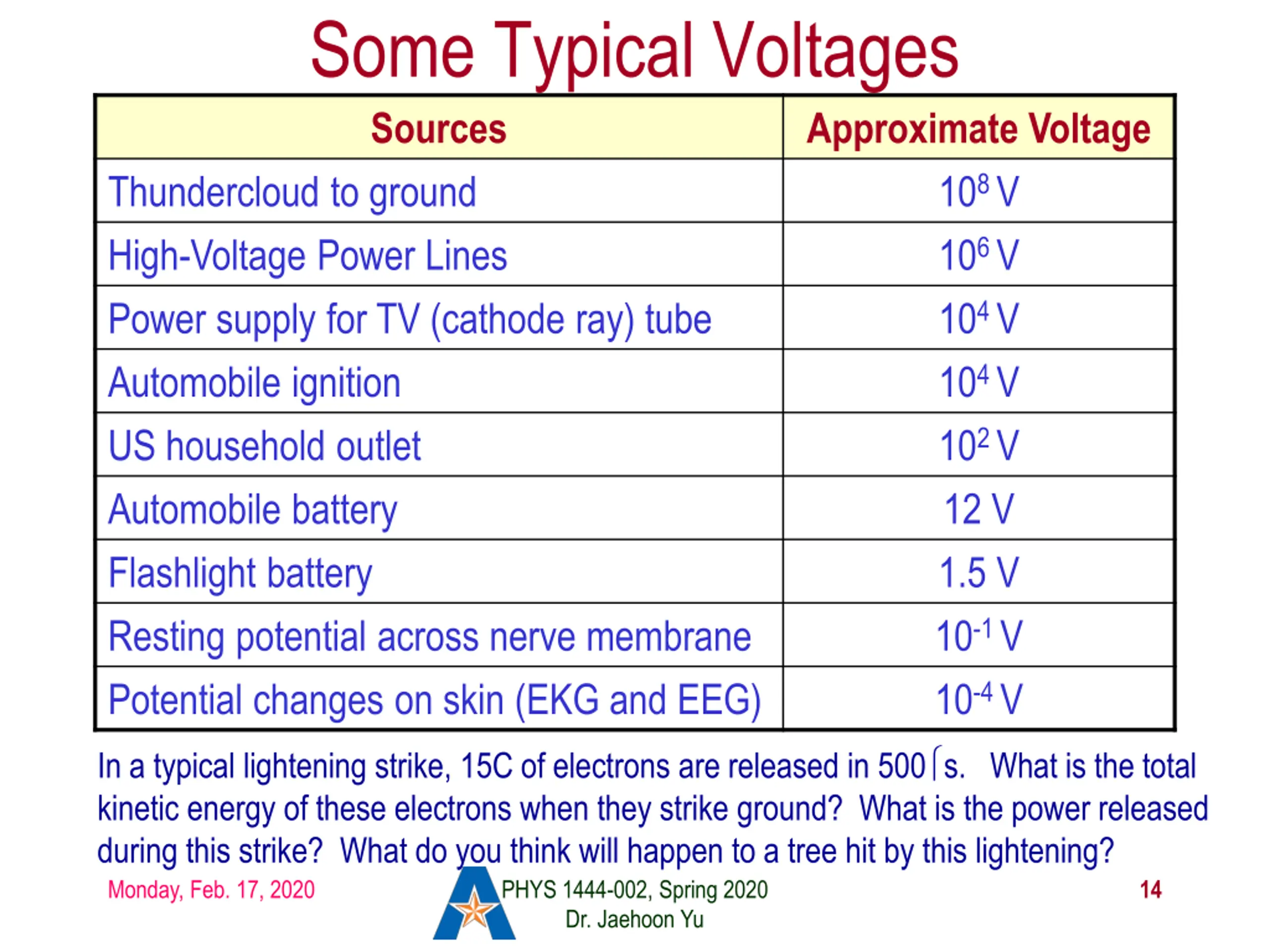 Some Typical Voltages Sources Thundercloud to ground High-Voltage Power Lines Power supply for TV (cathode ray) tube Automobile ignition US household outlet Automobile battery Flashlight battery Resting potential across nerve membrane Potential changes on skin (EKG and EEG) Approximate Voltage 108 V 106 V 104 V 104 V 102 V 12 V 1.5 V 10-1 V 10-4 V In a typical lightening strike, 15C of electrons are released in 500 s. What is the total kinetic energy of these electrons when they strike ground? What is the power released during this strike? What do you think will happen to a tree hit by this lightening? Monday, Feb. 17, 2020 PHYS 1444-002, Spring 2020 Dr. Jaehoon Yu 14