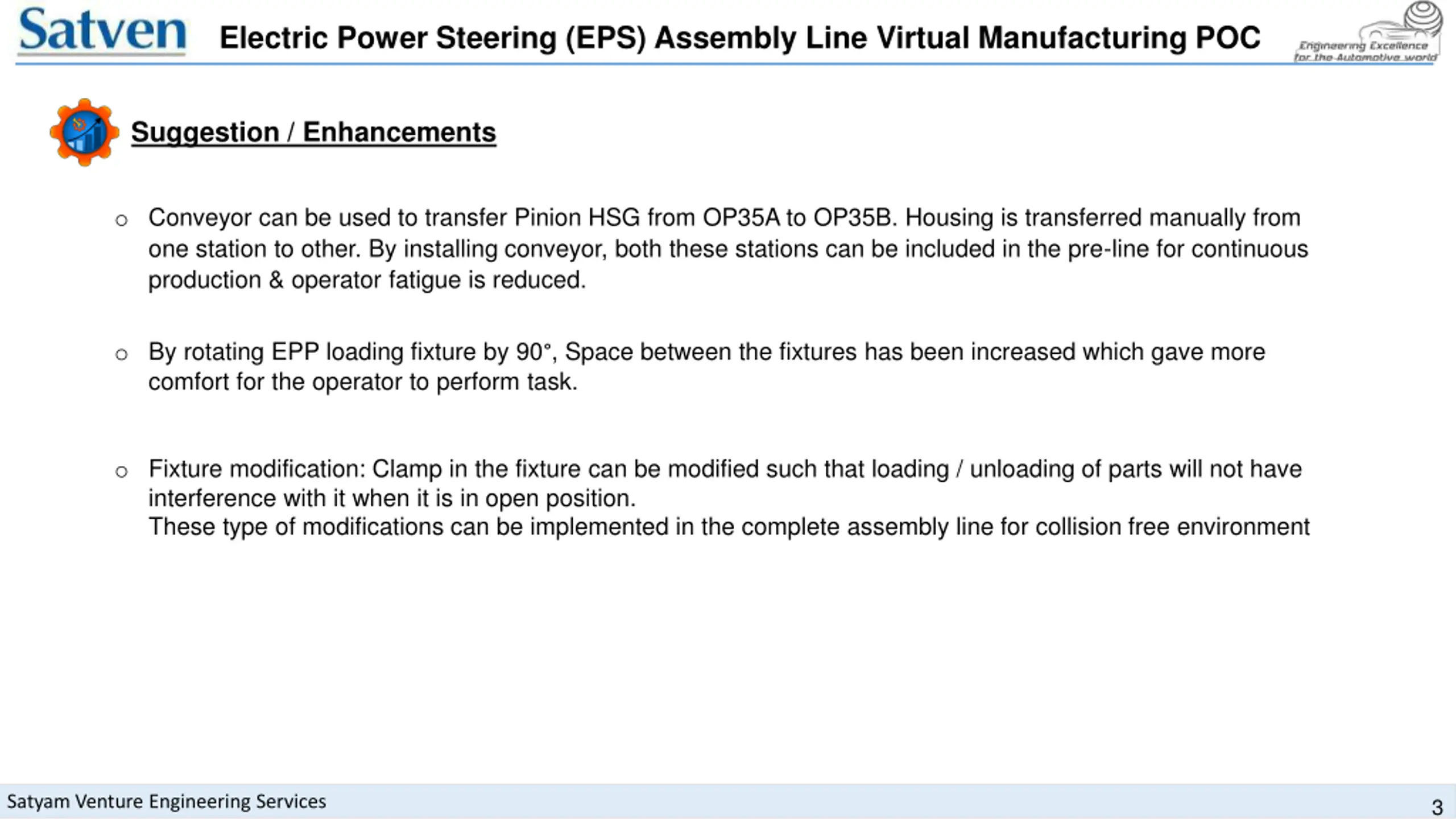 Electric Power Steering (EPS) Assembly Line Virtual Manufacturing POC Our Solution o Current EPS Assembly Line 3D Layout developed and each Assembly line (Pre-Line, Main-Line & Testing- Line) Processes simulated. o Identified and areas of issues and accordingly updated fixtures, Processes and Human related activities o Ergonomic study out identified the areas of improvement Main Line Test Line Pre-Line Satyam Venture Engineering Services 2