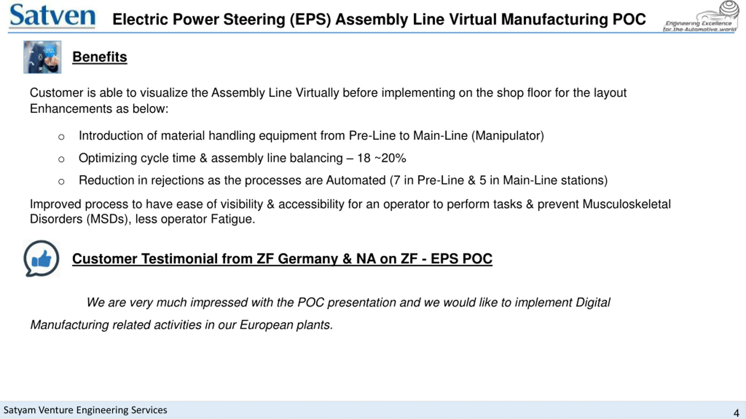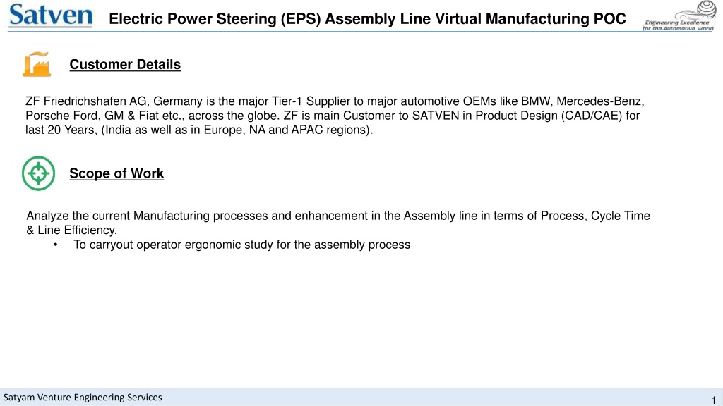 Electric Power Steering (EPS) Assembly Line Virtual Manufacturing POC Customer Details ZF Friedrichshafen AG, Germany is the major Tier-1 Supplier to major automotive OEMs like BMW, Mercedes-Benz, Porsche Ford, GM & Fiat etc., across the globe. ZF is main Customer to SATVEN in Product Design (CAD/CAE) for last 20 Years, (India as well as in Europe, NA and APAC regions). Scope of Work Analyze the current Manufacturing processes and enhancement in the Assembly line in terms of Process, Cycle Time & Line Efficiency. To carryout operator ergonomic study for the assembly process Satyam Venture Engineering Services 1