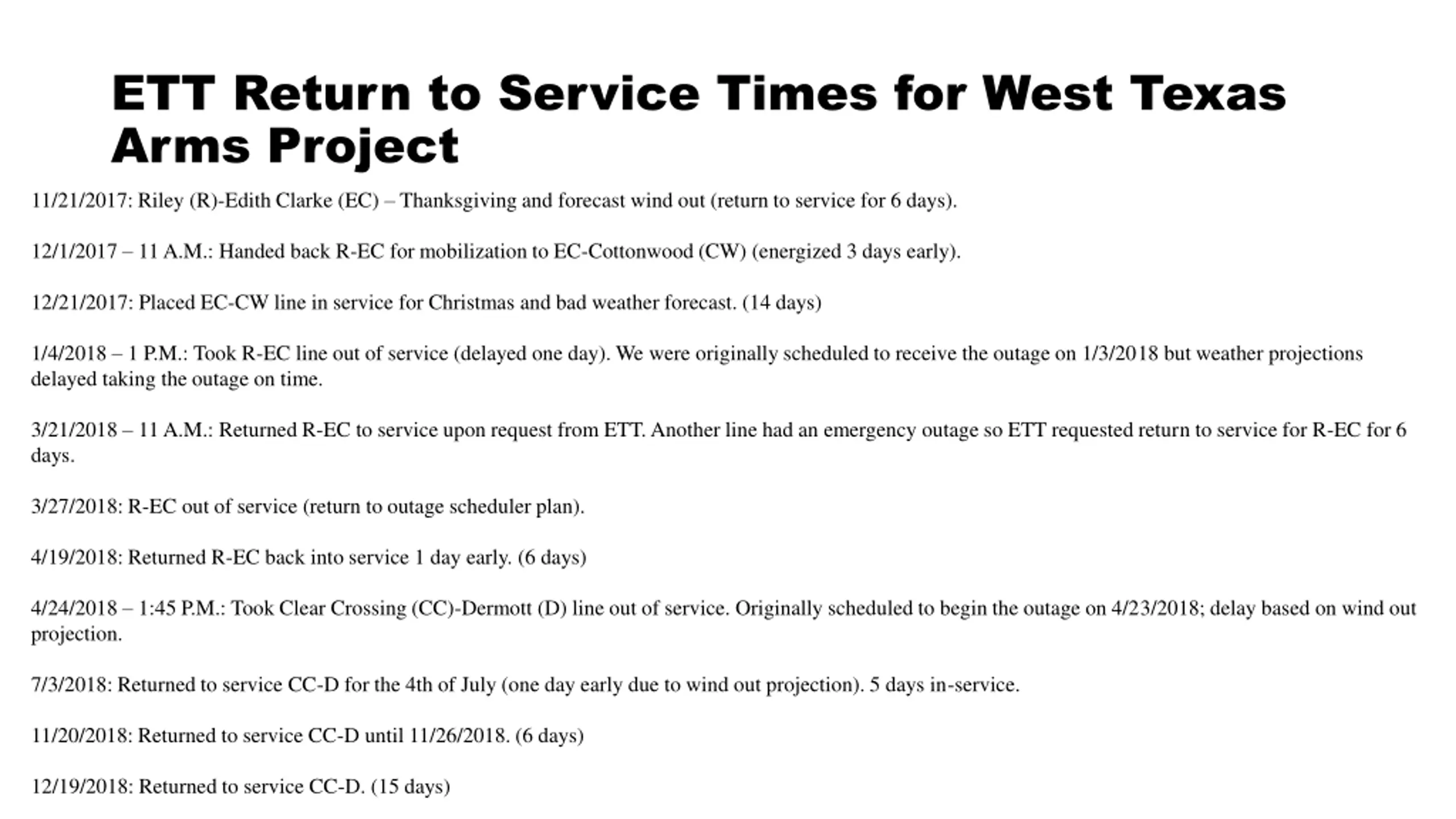 ETT Return to Service Times for West Texas Arms Project 11/21/2017: Riley (R)-Edith Clarke (EC) Thanksgiving and forecast wind out (return to service for 6 days). 12/1/2017 11 A.M.: Handed back R-EC for mobilization to EC-Cottonwood (CW) (energized 3 days early). 12/21/2017: Placed EC-CW line in service for Christmas and bad weather forecast. (14 days) 1/4/2018 1 P.M.: Took R-EC line out of service (delayed one day). We were originally scheduled to receive the outage on 1/3/2018 but weather projections delayed taking the outage on time. 3/21/2018 11 A.M.: Returned R-EC to service upon request from ETT. Another line had an emergency outage so ETT requested return to service for R-EC for 6 days. 3/27/2018: R-EC out of service (return to outage scheduler plan). 4/19/2018: Returned R-EC back into service 1 day early. (6 days) 4/24/2018 1:45 P.M.: Took Clear Crossing (CC)-Dermott (D) line out of service. Originally scheduled to begin the outage on 4/23/2018; delay based on wind out projection. 7/3/2018: Returned to service CC-D for the 4th of July (one day early due to wind out projection). 5 days in-service. 11/20/2018: Returned to service CC-D until 11/26/2018. (6 days) 12/19/2018: Returned to service CC-D. (15 days)