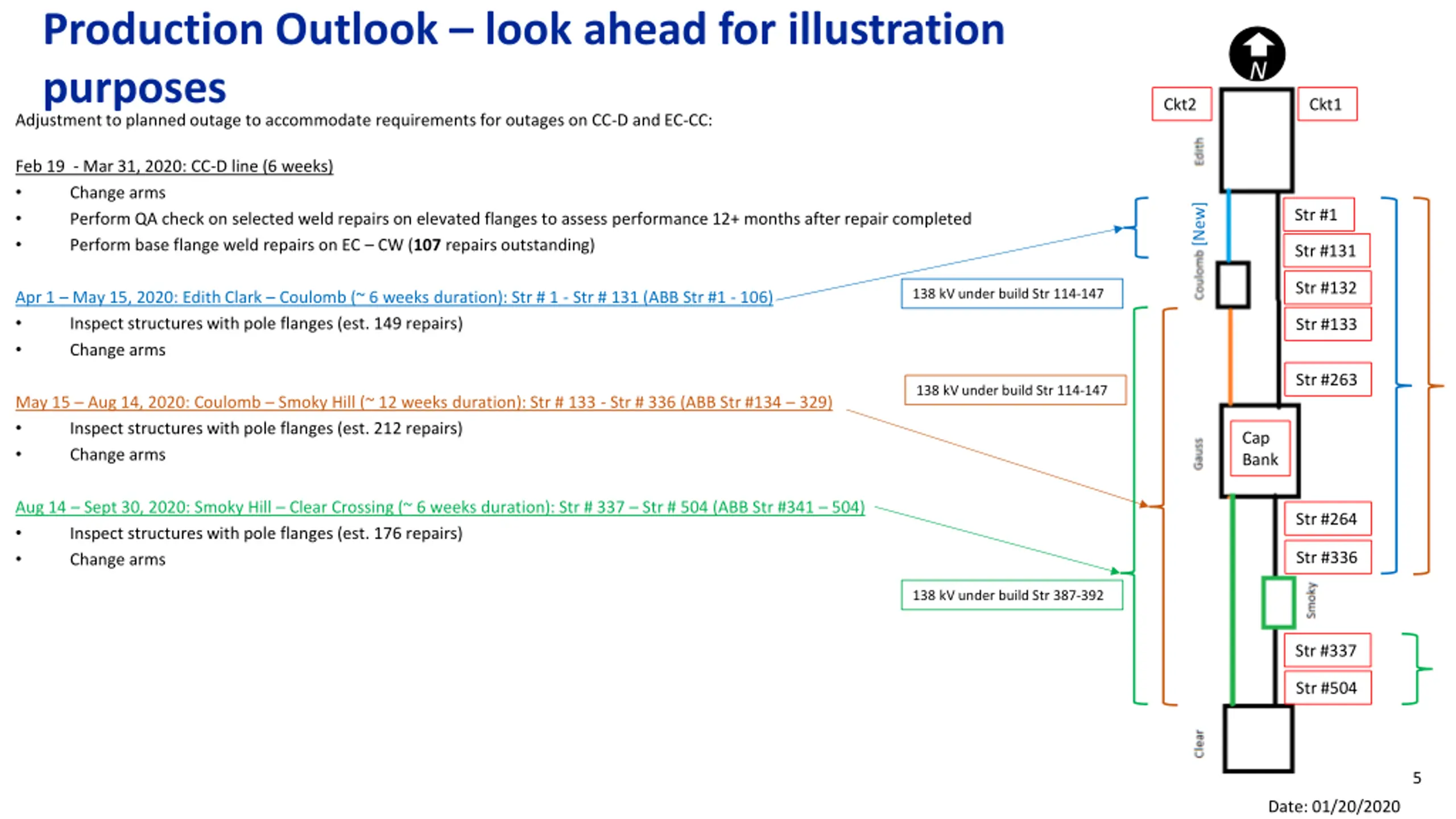 Production Outlook look ahead for illustration N Adjustment to planned outage to accommodate requirements for outages on CC-D and EC-CC: purposes Ckt2 Ckt1 Feb 19 - Mar 31, 2020: CC-D line (6 weeks) Change arms Perform QA check on selected weld repairs on elevated flanges to assess performance 12+ months after repair completed Perform base flange weld repairs on EC CW (107 repairs outstanding) [New] Str #1 Str #131 Str #132 138 kV under build Str 114-147 Apr 1 May 15, 2020: Edith Clark Coulomb (~ 6 weeks duration): Str # 1 - Str # 131 (ABB Str #1 - 106) Inspect structures with pole flanges (est. 149 repairs) Change arms Str #133 Str #263 138 kV under build Str 114-147 May 15 Aug 14, 2020: Coulomb Smoky Hill (~ 12 weeks duration): Str # 133 - Str # 336 (ABB Str #134 329) Inspect structures with pole flanges (est. 212 repairs) Change arms Cap Bank Aug 14 Sept 30, 2020: Smoky Hill Clear Crossing (~ 6 weeks duration): Str # 337 Str # 504 (ABB Str #341 504) Inspect structures with pole flanges (est. 176 repairs) Change arms Str #264 Str #336 138 kV under build Str 387-392 Str #337 Str #504 5 Date: 01/20/2020
