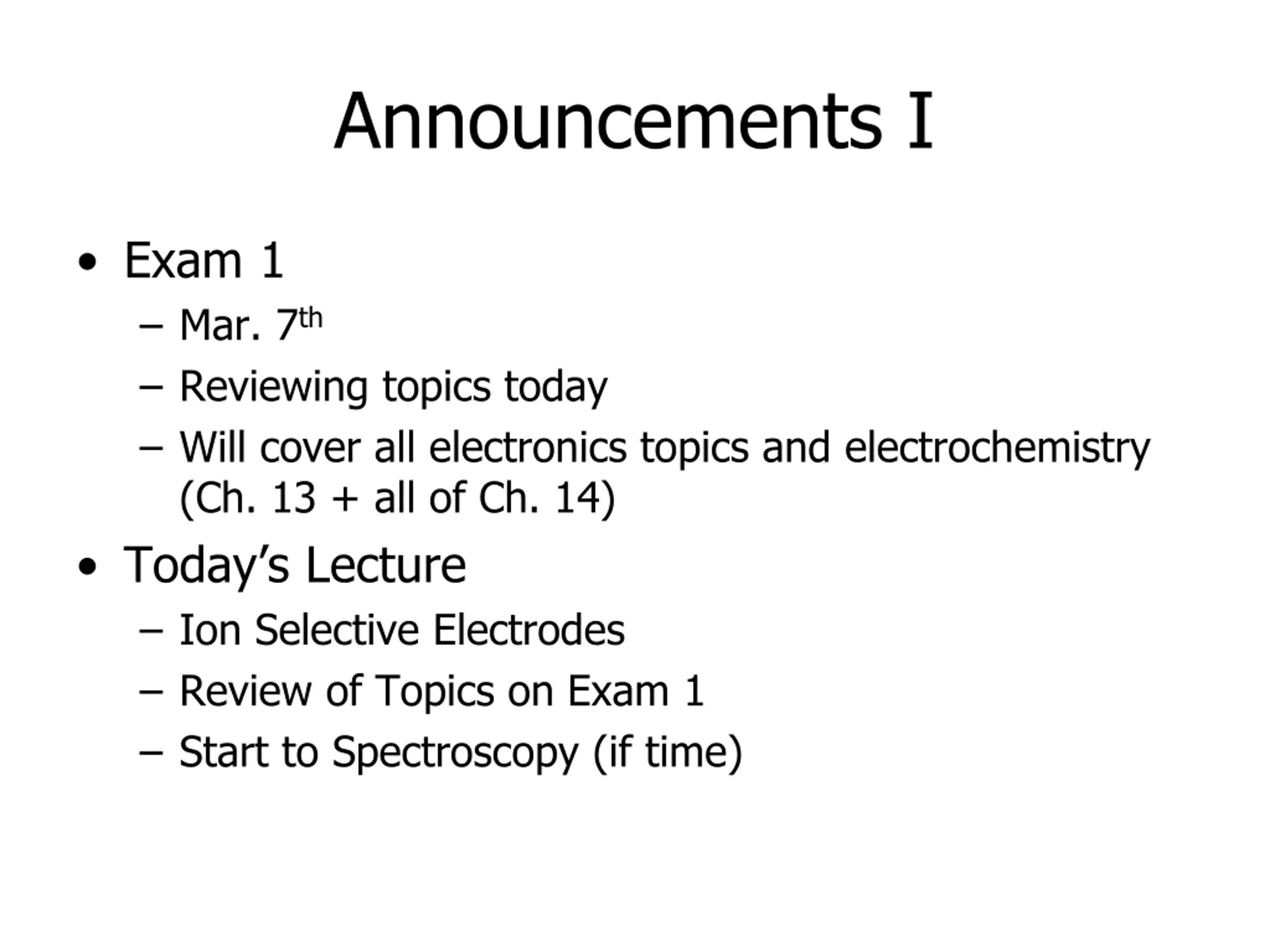 Announcements I Exam 1 Mar. 7th Reviewing topics today Will cover all electronics topics and electrochemistry (Ch. 13 + all of Ch. 14) Today s Lecture Ion Selective Electrodes Review of Topics on Exam 1 Start to Spectroscopy (if time)