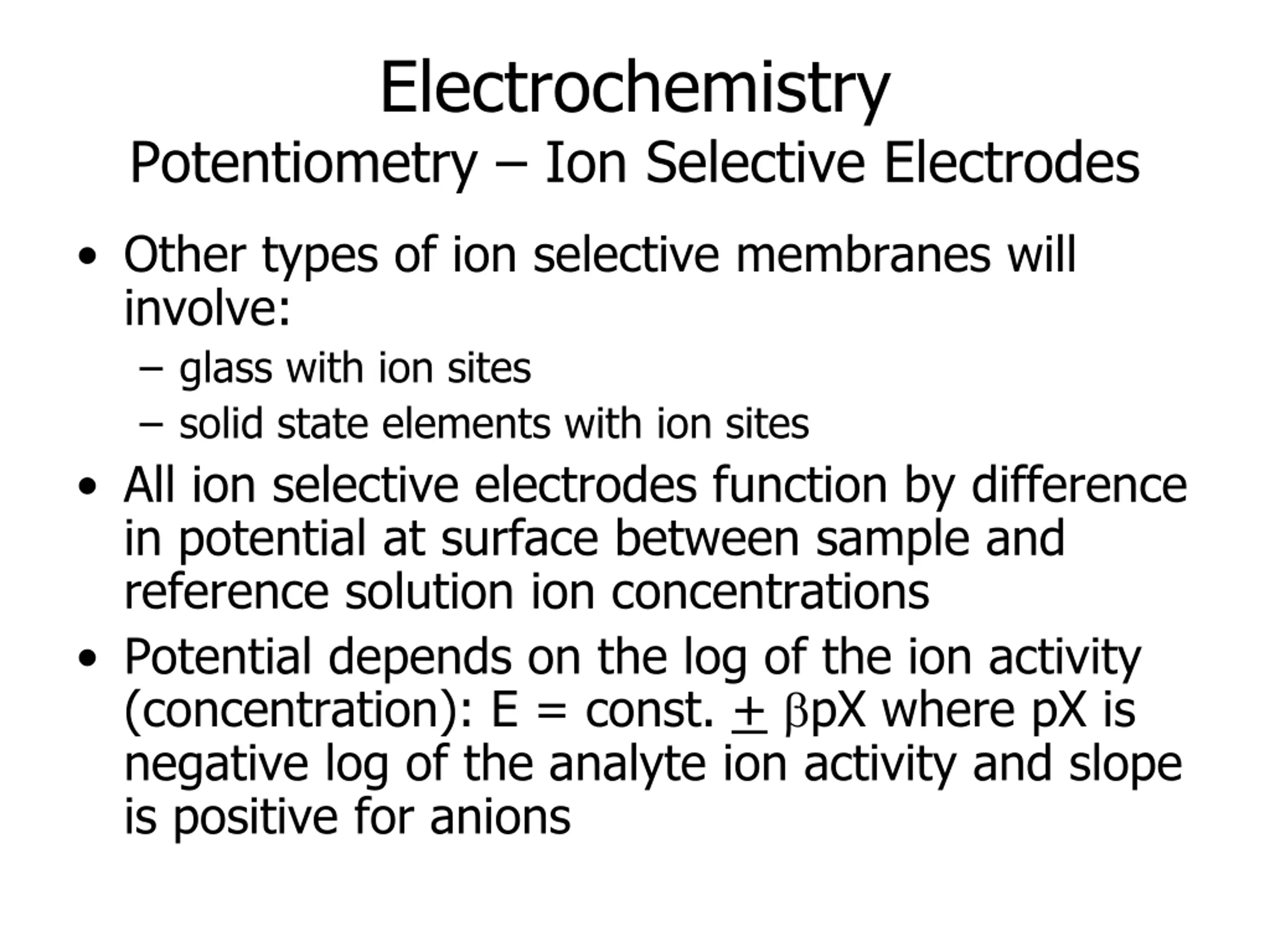 Electrochemistry Potentiometry Ion Selective Electrodes Other types of ion selective membranes will involve: glass with ion sites solid state elements with ion sites All ion selective electrodes function by difference in potential at surface between sample and reference solution ion concentrations Potential depends on the log of the ion activity (concentration): E = const. + pX where pX is negative log of the analyte ion activity and slope is positive for anions