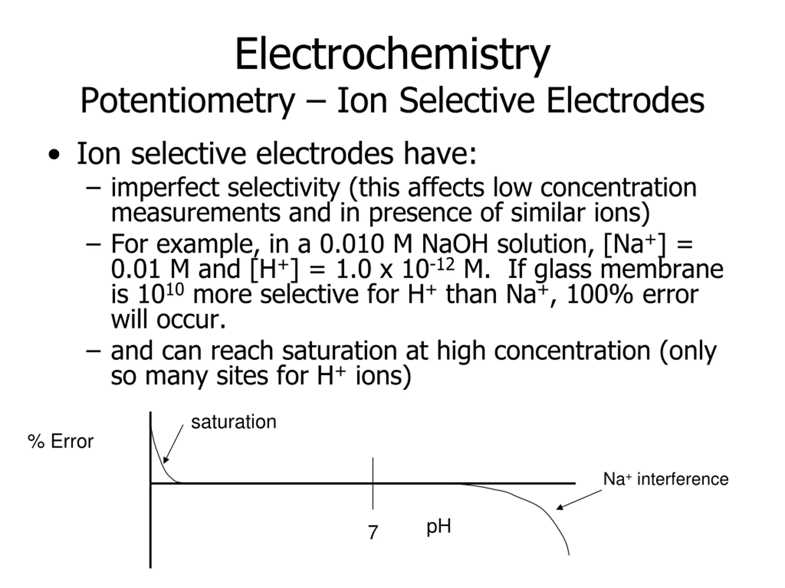 Electrochemistry Potentiometry Ion Selective Electrodes Ion selective electrodes have: imperfect selectivity (this affects low concentration measurements and in presence of similar ions) For example, in a 0.010 M NaOH solution, [Na+] = 0.01 M and [H+] = 1.0 x 10-12 M. If glass membrane is 1010 more selective for H+ than Na+, 100% error will occur. and can reach saturation at high concentration (only so many sites for H+ ions) saturation % Error Na+ interference pH 7