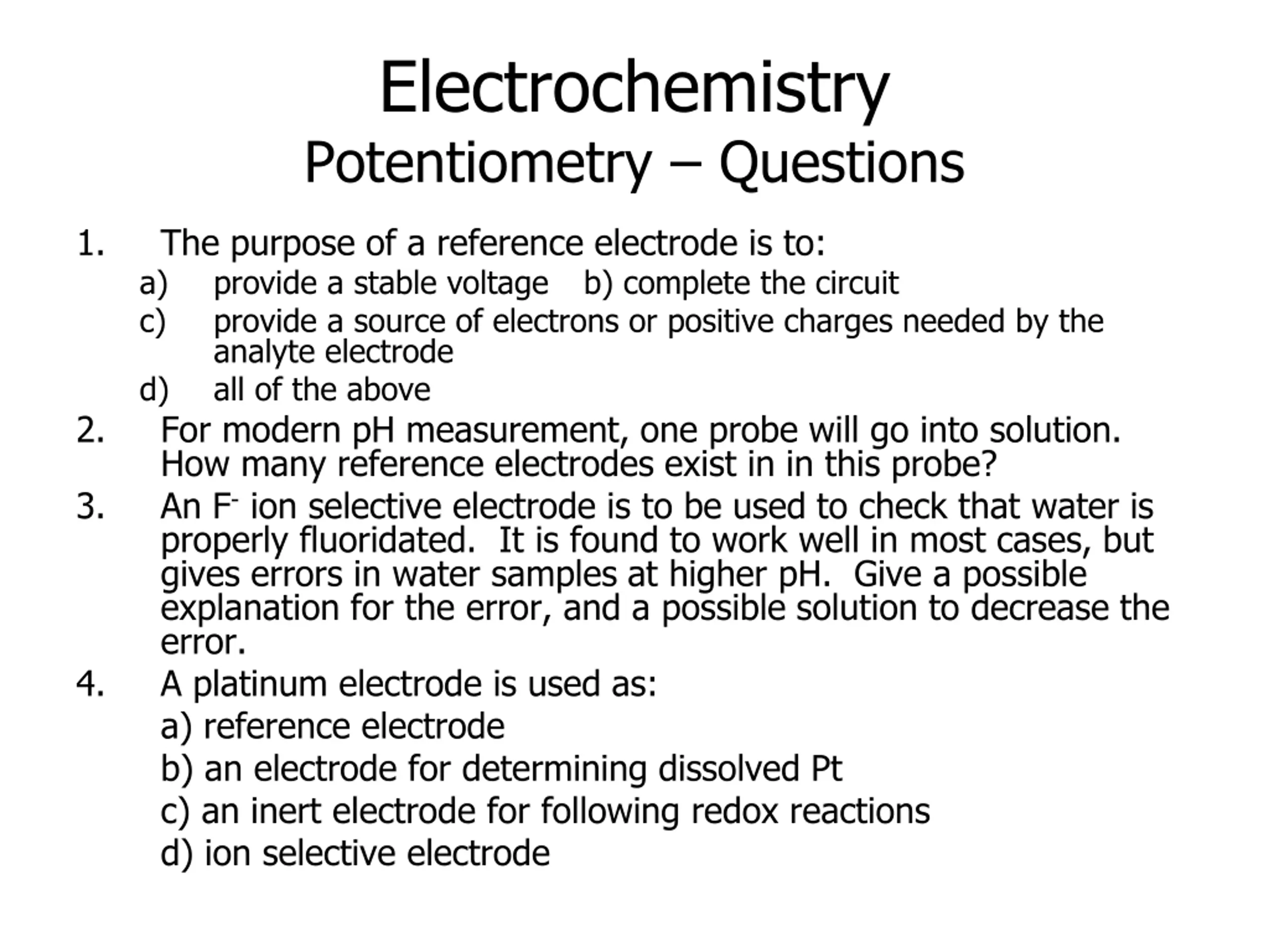 Electrochemistry Potentiometry Questions 1. The purpose of a reference electrode is to: a) provide a stable voltage b) complete the circuit c) provide a source of electrons or positive charges needed by the analyte electrode d) all of the above For modern pH measurement, one probe will go into solution. How many reference electrodes exist in in this probe? An F- ion selective electrode is to be used to check that water is properly fluoridated. It is found to work well in most cases, but gives errors in water samples at higher pH. Give a possible explanation for the error, and a possible solution to decrease the error. A platinum electrode is used as: a) reference electrode b) an electrode for determining dissolved Pt c) an inert electrode for following redox reactions d) ion selective electrode 2. 3. 4.
