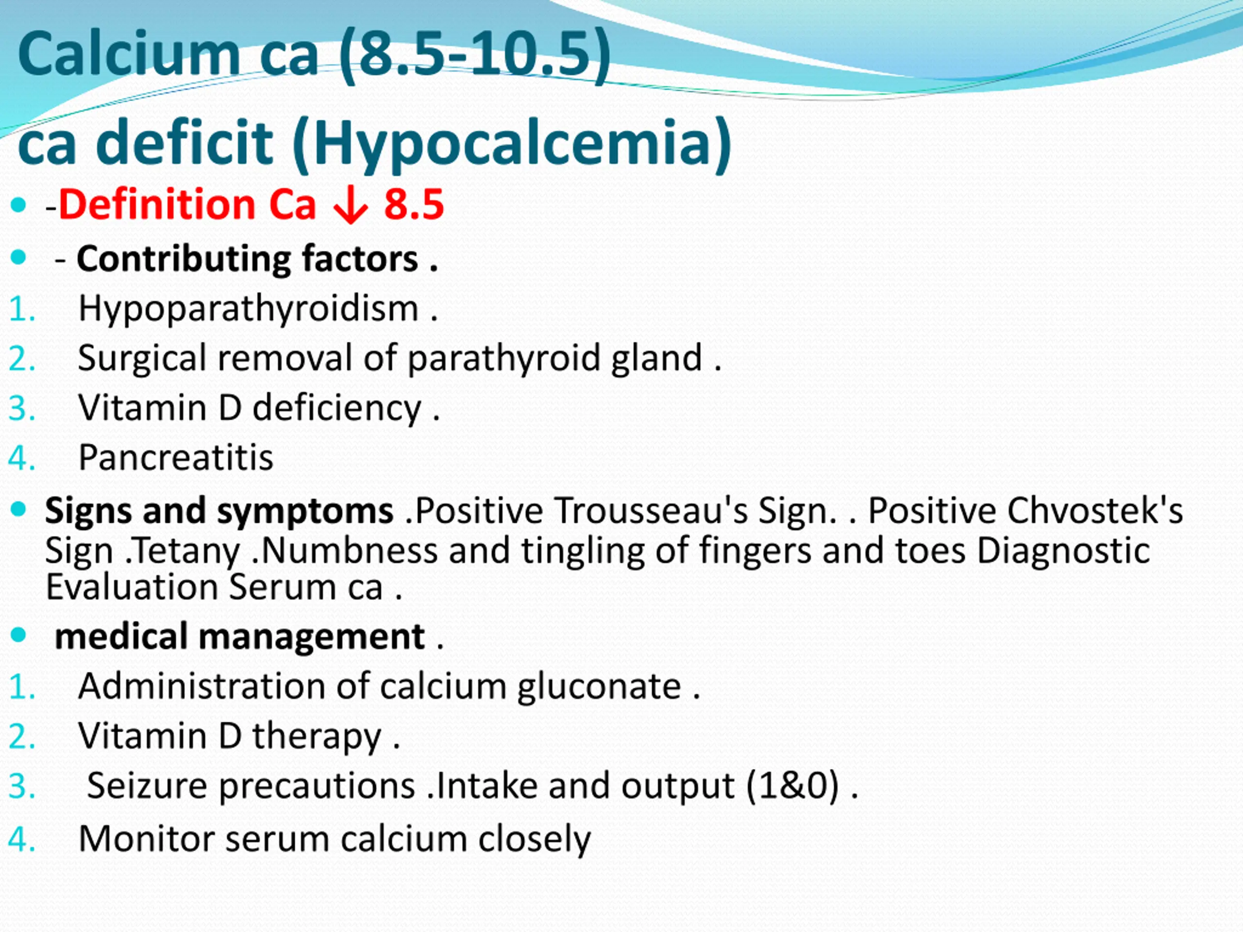 Calcium ca (8.5-10.5) ca deficit (Hypocalcemia) -Definition Ca 8.5 - Contributing factors . 1. Hypoparathyroidism . 2. Surgical removal of parathyroid gland . 3. Vitamin D deficiency . 4. Pancreatitis Signs and symptoms .Positive Trousseau's Sign. . Positive Chvostek's Sign .Tetany .Numbness and tingling of fingers and toes Diagnostic Evaluation Serum ca . medical management . 1. Administration of calcium gluconate . 2. Vitamin D therapy . 3. Seizure precautions .Intake and output (1&0) . 4. Monitor serum calcium closely