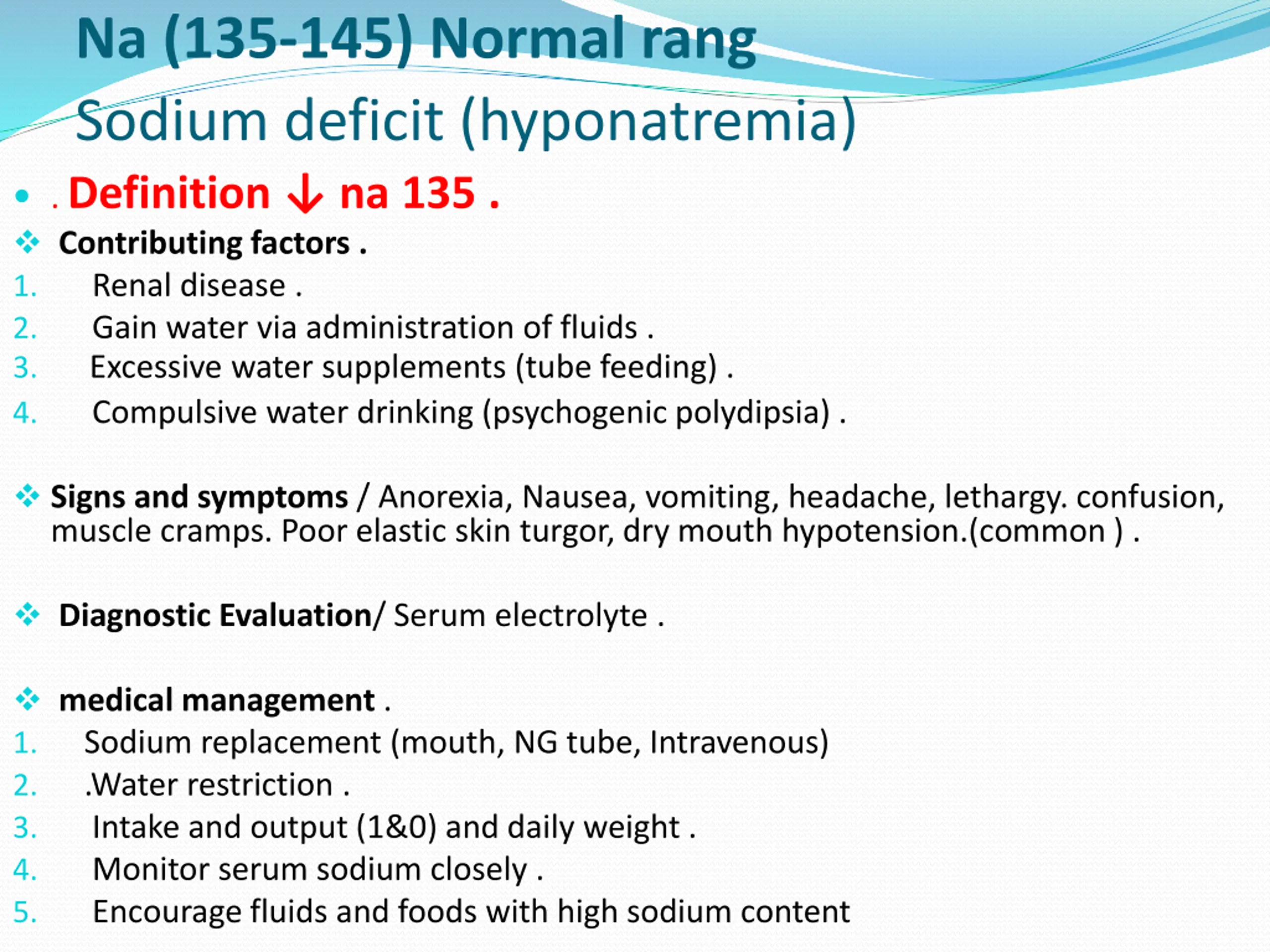 Na (135-145) Normal rang Sodium deficit (hyponatremia) . Definition na 135 . Contributing factors . 1. Renal disease . 2. Gain water via administration of fluids . 3. Excessive water supplements (tube feeding) . 4. Compulsive water drinking (psychogenic polydipsia) . Signs and symptoms / Anorexia, Nausea, vomiting, headache, lethargy. confusion, muscle cramps. Poor elastic skin turgor, dry mouth hypotension.(common ) . Diagnostic Evaluation/ Serum electrolyte . medical management . 1. Sodium replacement (mouth, NG tube, Intravenous) 2. .Water restriction . 3. Intake and output (1&0) and daily weight . 4. Monitor serum sodium closely . 5. Encourage fluids and foods with high sodium content