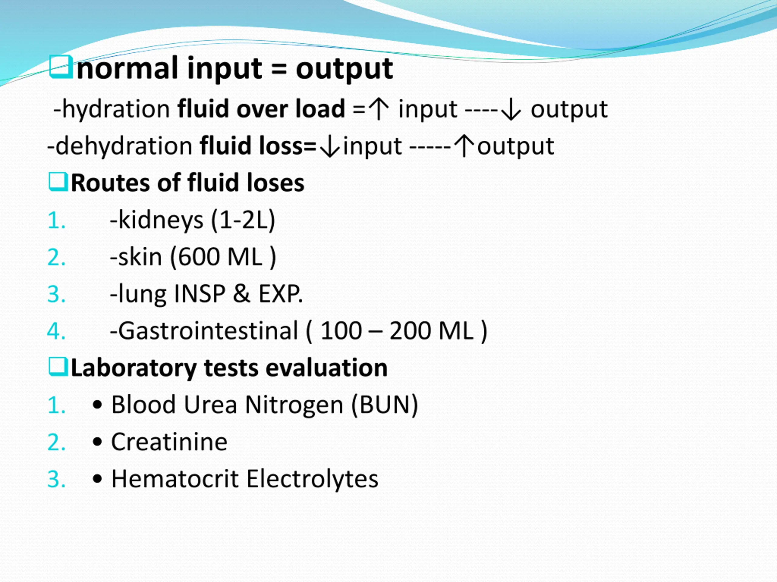 normal input = output -hydration fluid over load = input ---- output -dehydration fluid loss= input ----- output Routes of fluid loses 1. -kidneys (1-2L) 2. -skin (600 ML ) 3. -lung INSP & EXP. 4. -Gastrointestinal ( 100 200 ML ) Laboratory tests evaluation 1. Blood Urea Nitrogen (BUN) 2. Creatinine 3. Hematocrit Electrolytes