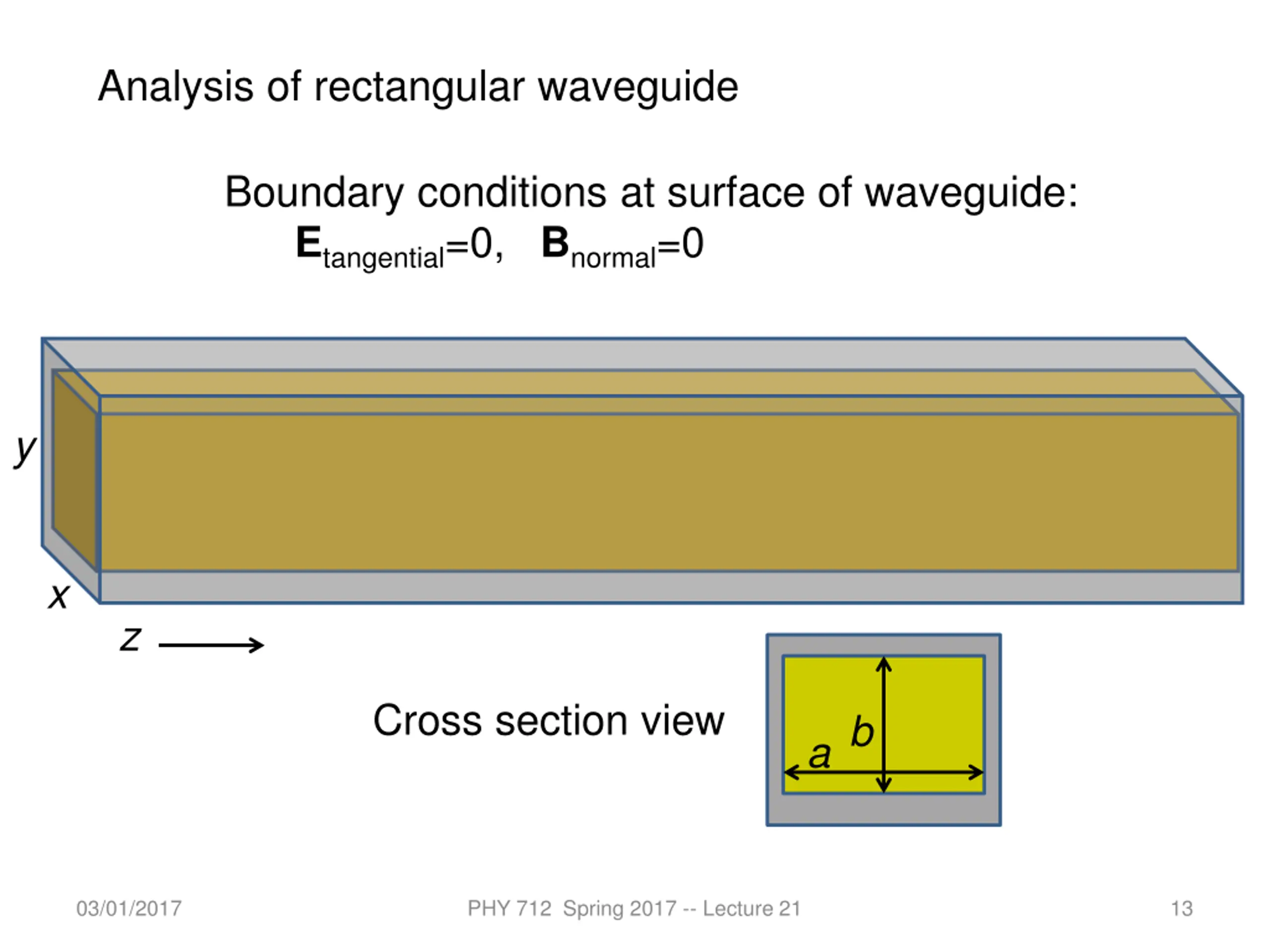 Waveguide terminology TEM: transverse electric and magnetic (both E and H fields are perpendicular to wave propagation direction) TM: transverse magnetic (H field is perpendicular to wave propagation direction) TE: transverse electric (E field is perpendicular to wave propagation direction) 03/01/2017 PHY 712 Spring 2017 -- Lecture 21 12