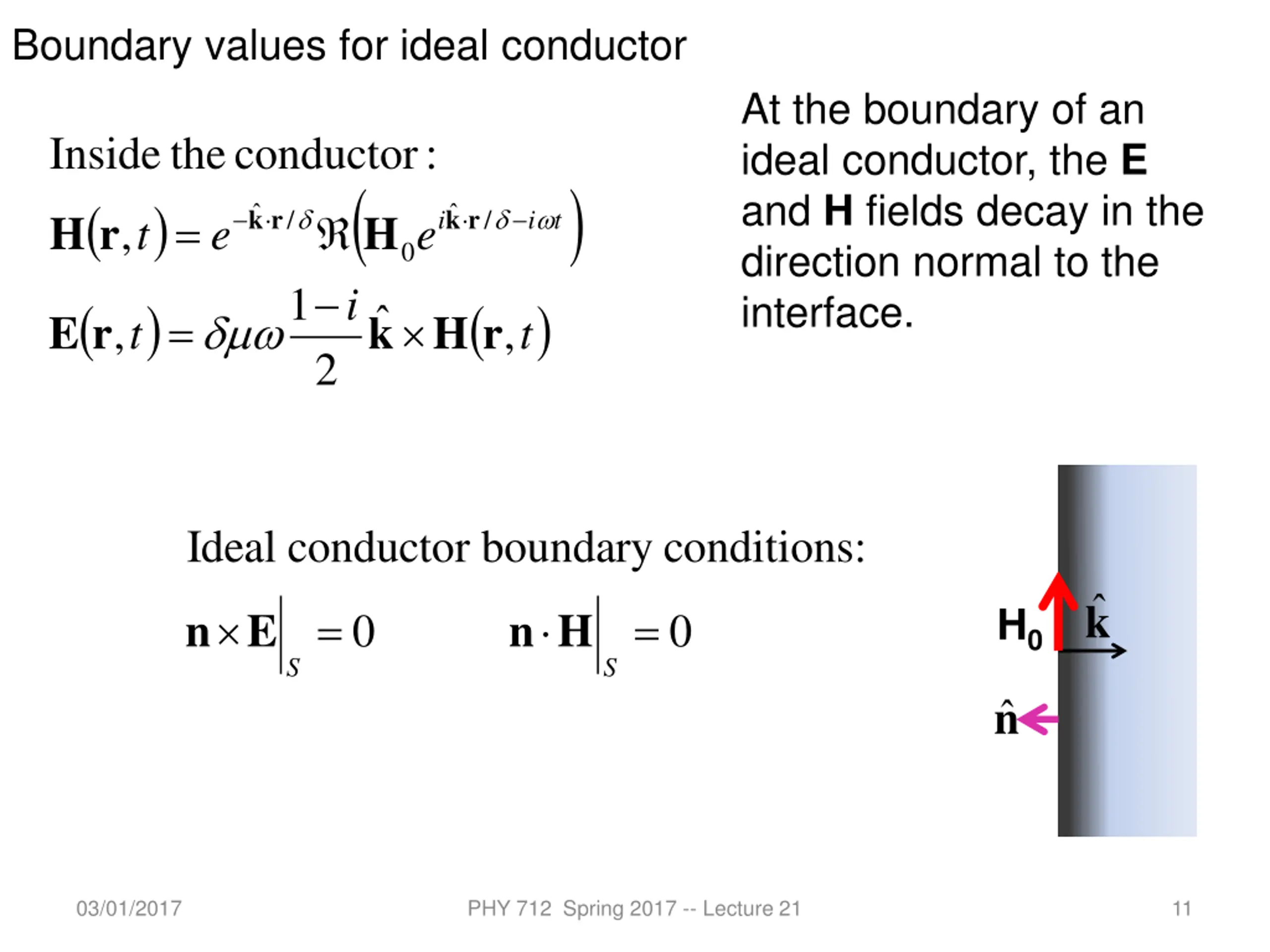 Fields near the surface on an ideal conductor -- continued ( i t t + = = H r k E r ) ( ) k r k r i t = / / i E r E , t e e 0 ( ) ( ) ( ) = = D r E r E r , , , t r|| 1 n i ( ) ( ) ( ) k E r , , , t t t c + 1 E n c i 0 z ( ) ( ) ( ) ( ) k E r k E r = = = B r H r , , , , t t t t Note that the field is larger than field so we can write: H ( i ) ( ) k r k r i t = / / i H r H , t e e 0 1 ( ) ( ) k H r = E r , , t t 2 03/01/2017 PHY 712 Spring 2017 -- Lecture 21 10