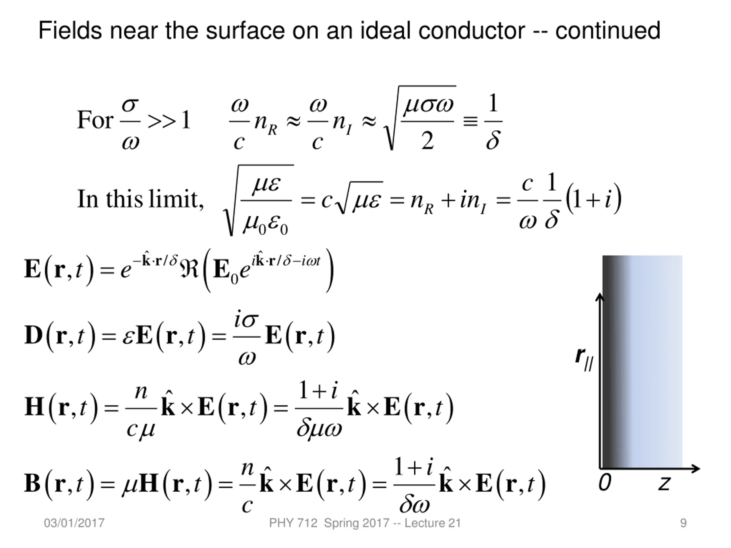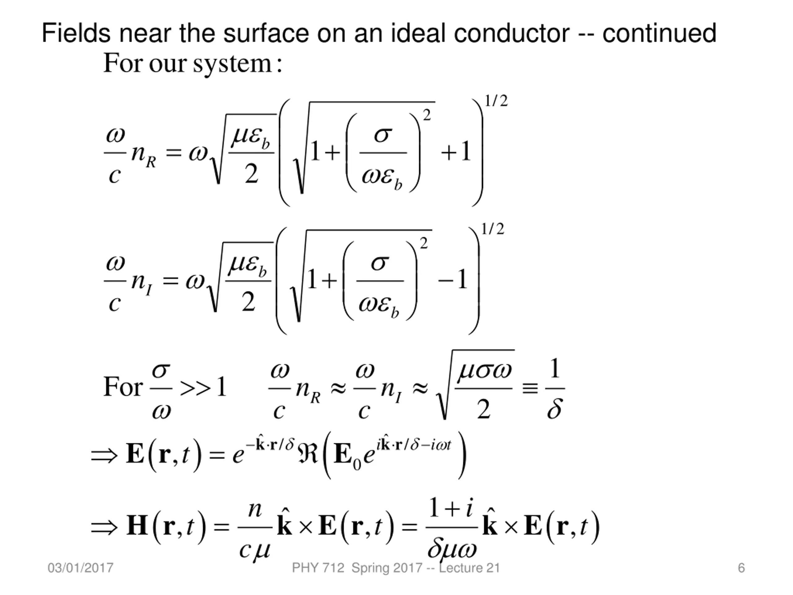 Fields near the surface on an ideal conductor -- continued : system our For / 1 2 2 2 c = + + 1 1 b n R b / 1 2 2 2 c = + 1 1 b n I b c c e 2 ) i 1 For 1 n n R I ( ( ) k r k r i t = / / i E r E , t e 0 + 1 n ( ) ( ) ( ) k E r k E r = = H r , , , t t t c 03/01/2017 PHY 712 Spring 2017 -- Lecture 21 6
