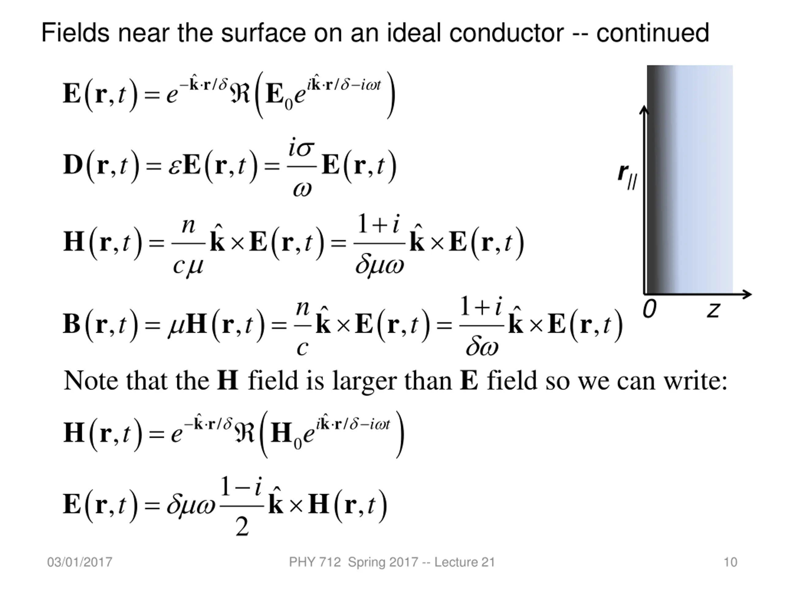 Fields near the surface on an ideal conductor -- continued 1 For 1 n n R I 2 c c 1 c ( ) i = = + = + In this limit, 1 c n in R I 0 0 ( ) ( ) k r k r i t = / / i E r E , t e e 0 i ( ) ( ) ( ) = = D r E r E r , , , t t t r|| + 1 n i ( ) ( ) ( ) k E r k E r = = H r , , , t t t c + 1 n c i ( ) ( ) ( ) ( ) k E r k E r = = = B r H r 0 z , , , , t t t t 03/01/2017 PHY 712 Spring 2017 -- Lecture 21 9