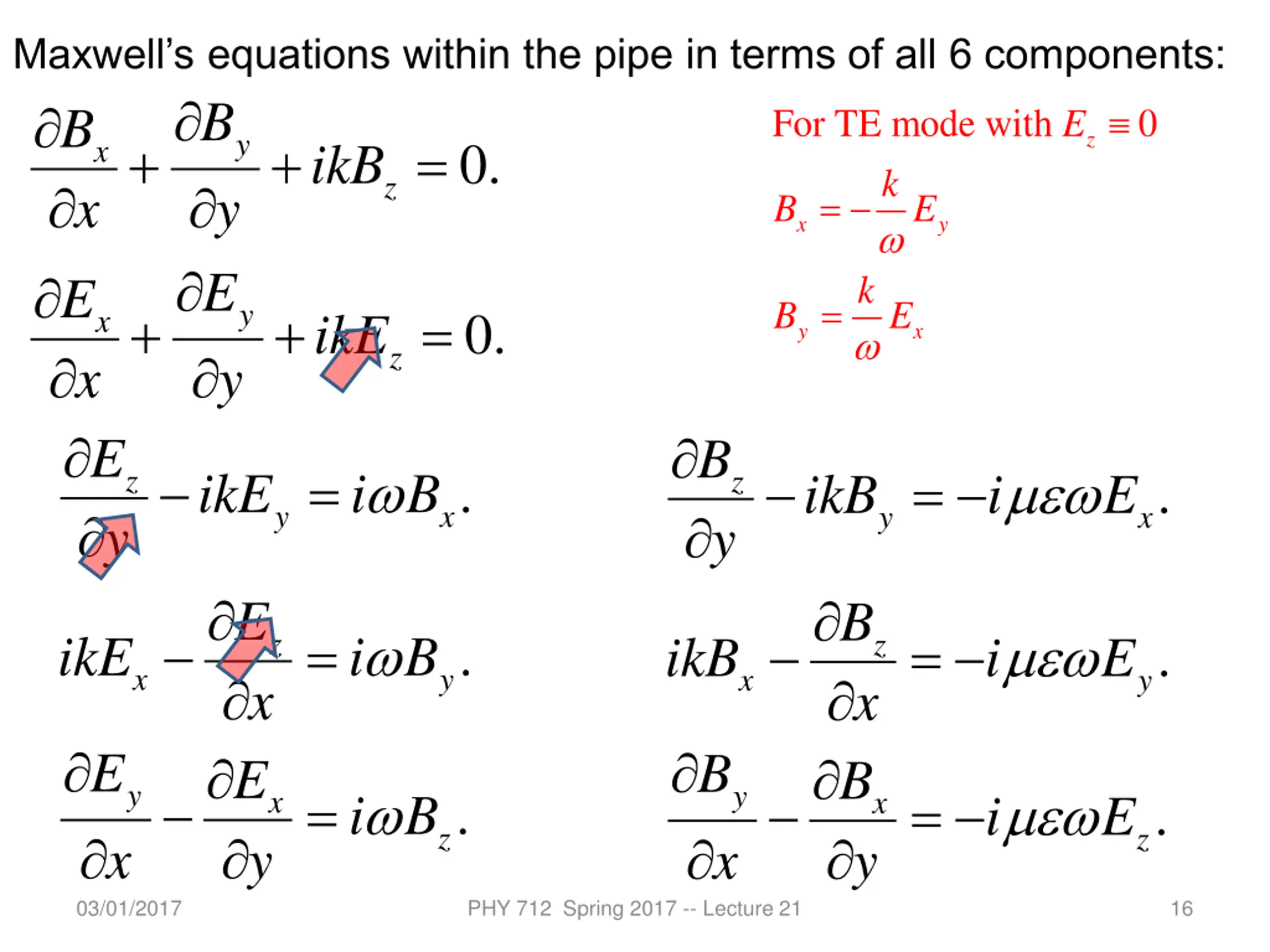 Maxwells equations within the pipe in terms of all 6 components: B B ikB x y E E ikE x y E ikE i B y E ikE i B x E E i B x y 03/01/2017 For TE mode with k B E 0 E y z + + = 0. x z = x y k = B E y + + = 0. x y x z B y = = . z . ikB i E z y x y x B x B y = = . z . ikB i E z x y x y B x y y = = . x . x i E z z PHY 712 Spring 2017 -- Lecture 21 16