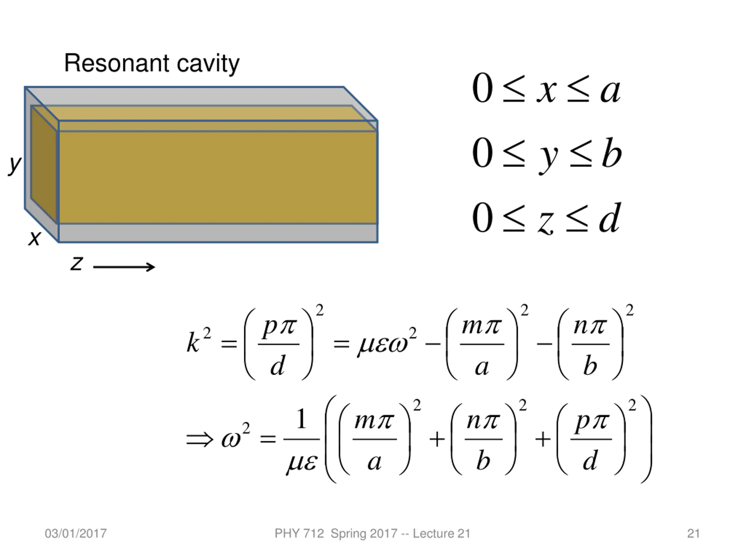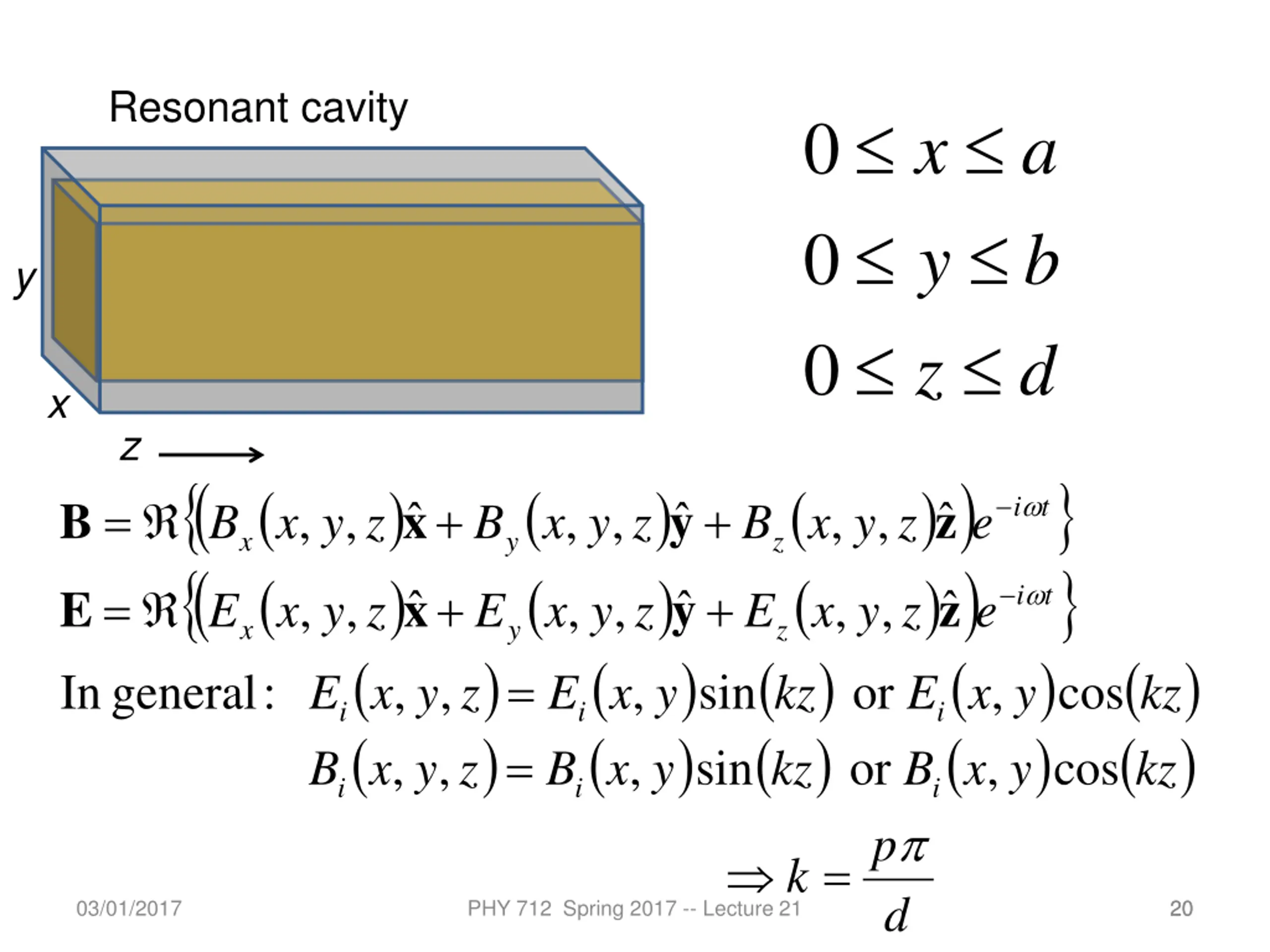Resonant cavity 0 x a 0 y b y 0 z d x z cos ( ( ) ) ( ( ( ( : ) ) , ( ( ) ) y ( ( ) ) = + + i t B x y z , , , , , , B x y z B x y z B x y z e x y z = + + i t E x y z , , , , , , E x y z E x y z E x y z e x y = z ( ( ) ) ( ( ) ) ( ) ( ) kz ) ) ( ) ( ) kz general In , , sin or , E x y z E x kz E x y kz i i i = , , , sin or , cos B x y z B x y B x y i i i p = 03/01/2017 PHY 712 Spring 2017 -- Lecture 21 k d 20 20