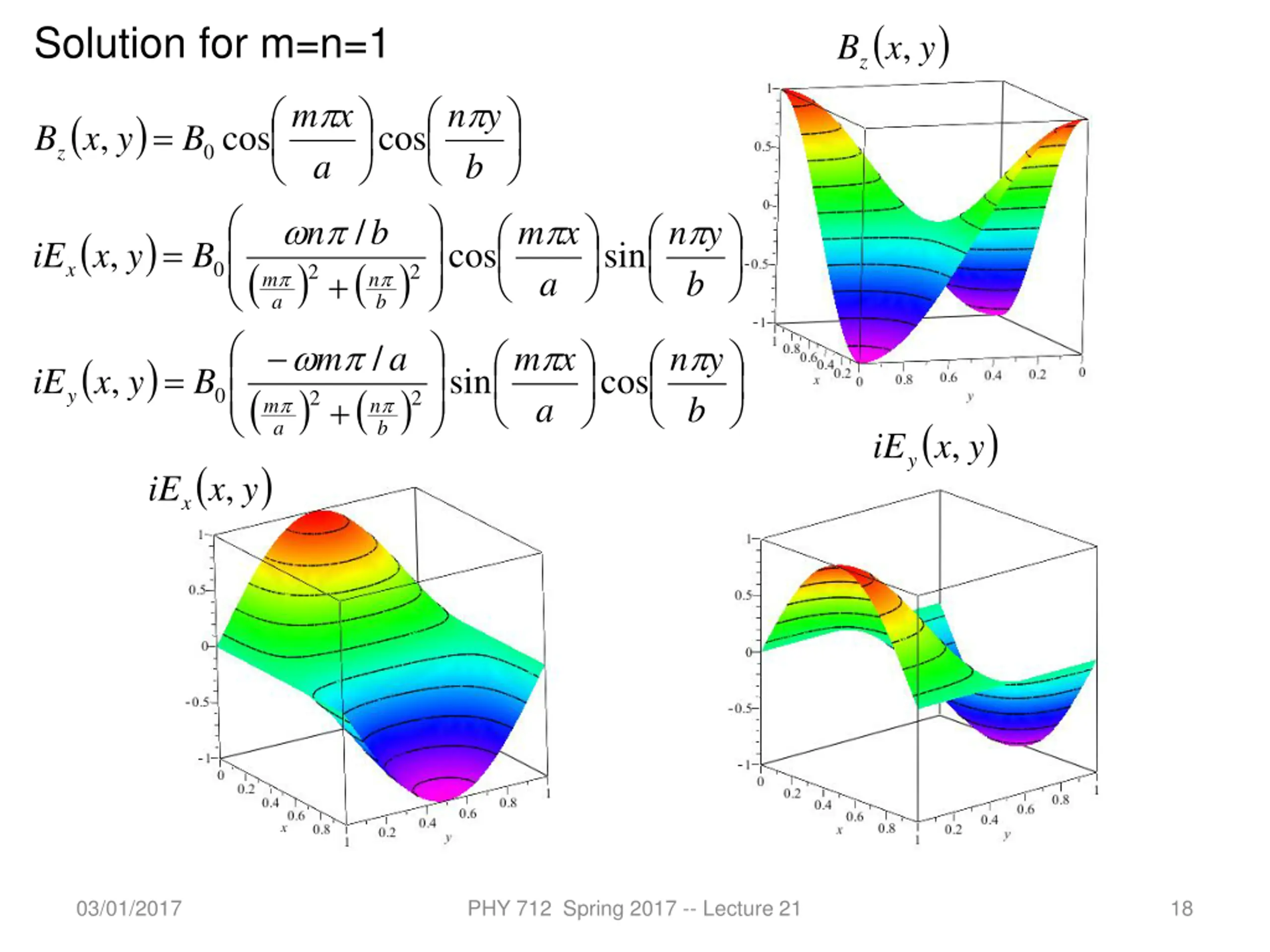 ( ) y Solution for m=n=1 , Bz x m x n y ( ) = , cos cos B x y B 0 z a b / n 2 b m x n y ( ) = , cos sin iE x y B ( ) a ( ) b 0 x 2 + a b m n / m 2 a m x n y ( ) = , sin cos iE x y B ( ) a ) y ( ) b 0 y 2 + a b m n ( ) y , iEy x ( , iEx x 03/01/2017 PHY 712 Spring 2017 -- Lecture 21 18