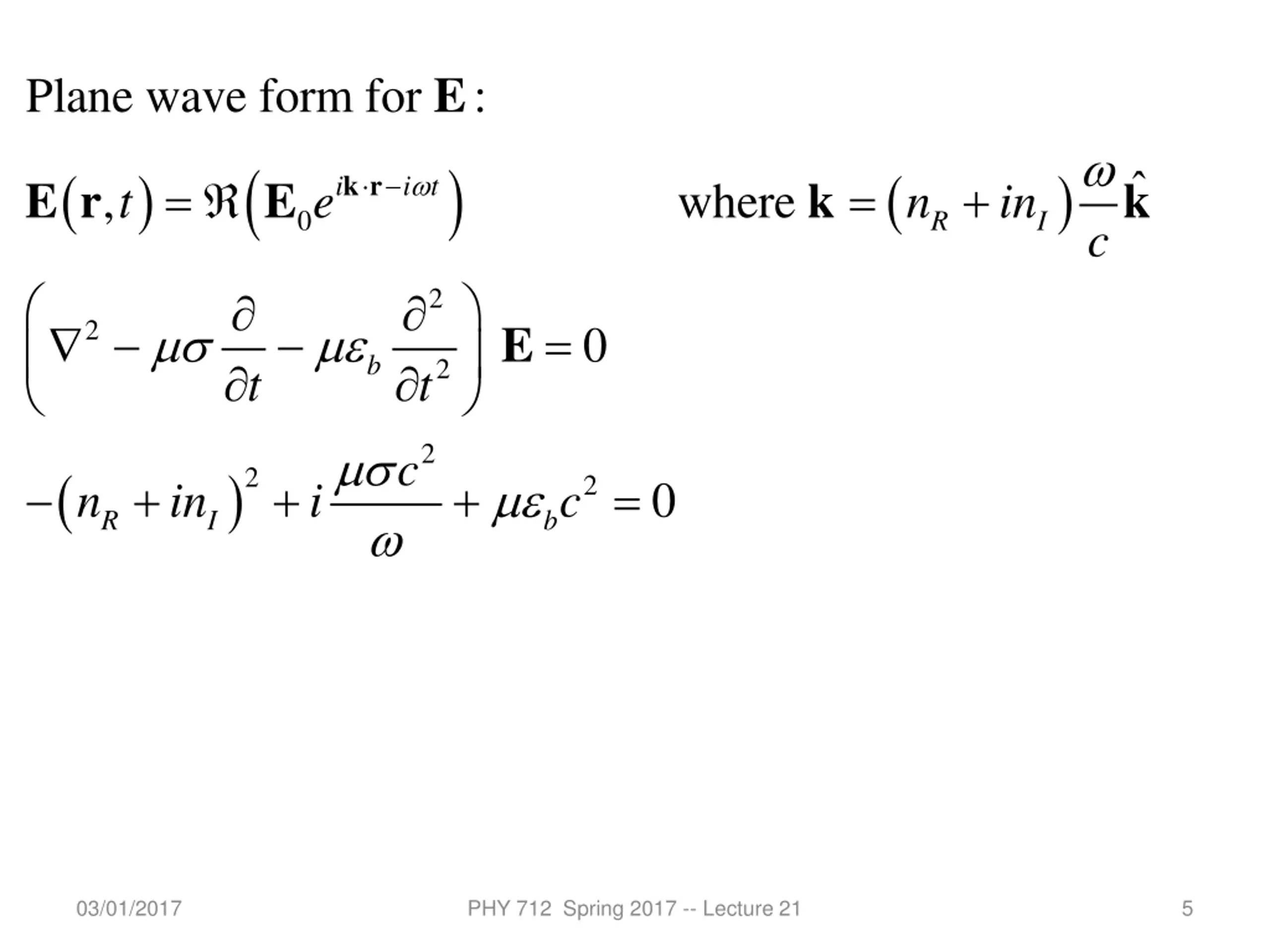 E Plane wave form for : ( ) ( ) ( ) k k r i t = = + i E r E k , where t e n in 0 R I c 2 = 2 E 0 b 2 t t 2 c ( ) 2 + + + = 2 0 n in i c R I b 03/01/2017 PHY 712 Spring 2017 -- Lecture 21 5