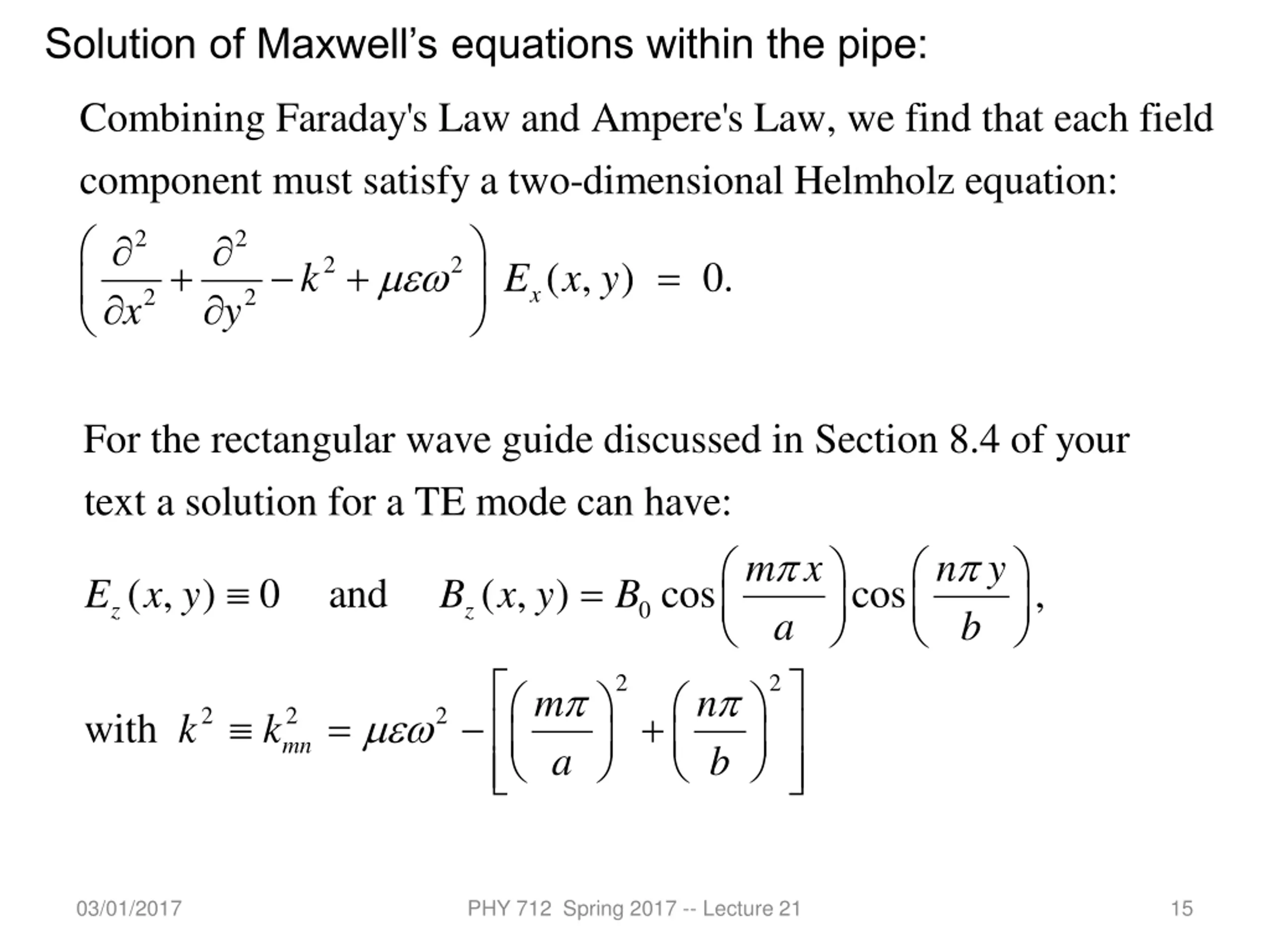 Solution of Maxwells equations within the pipe: Combining Faraday's Law and Ampere's Law, we find that each field component must satisfy a two-dimensional Helmholz equation: + + 2 2 = 2 2 ( , ) 0. k E x y x 2 2 x y For the rectangular wave guide discussed in Section 8.4 of your text a solution for a TE mode can hav e: m x a n y b = ( , ) E x y 0 and ( , ) B x y cos cos , B 0 z z 2 2 m n = + 2 2 mn 2 wit h k k a b 03/01/2017 PHY 712 Spring 2017 -- Lecture 21 15
