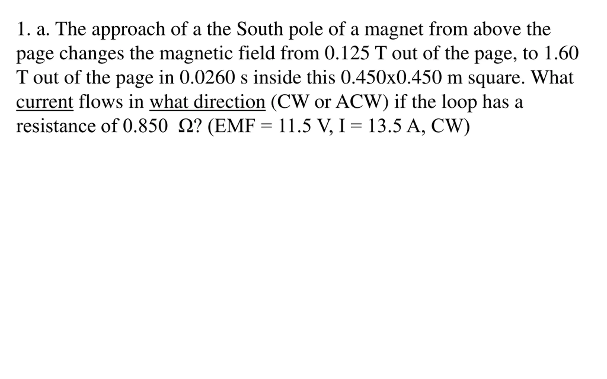 1. a. The approach of a the South pole of a magnet from above the page changes the magnetic field from 0.125 T out of the page, to 1.60 T out of the page in 0.0260 s inside this 0.450x0.450 m square. What current flows in what direction (CW or ACW) if the loop has a resistance of 0.850 ? (EMF = 11.5 V, I = 13.5 A, CW)
