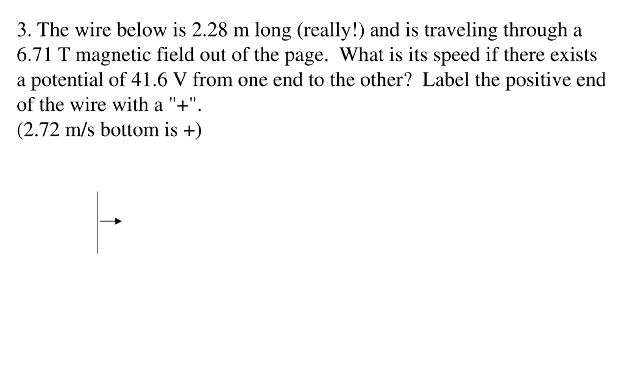 3. The wire below is 2.28 m long (really!) and is traveling through a 6.71 T magnetic field out of the page. What is its speed if there exists a potential of 41.6 V from one end to the other? Label the positive end of the wire with a "+". (2.72 m/s bottom is +)