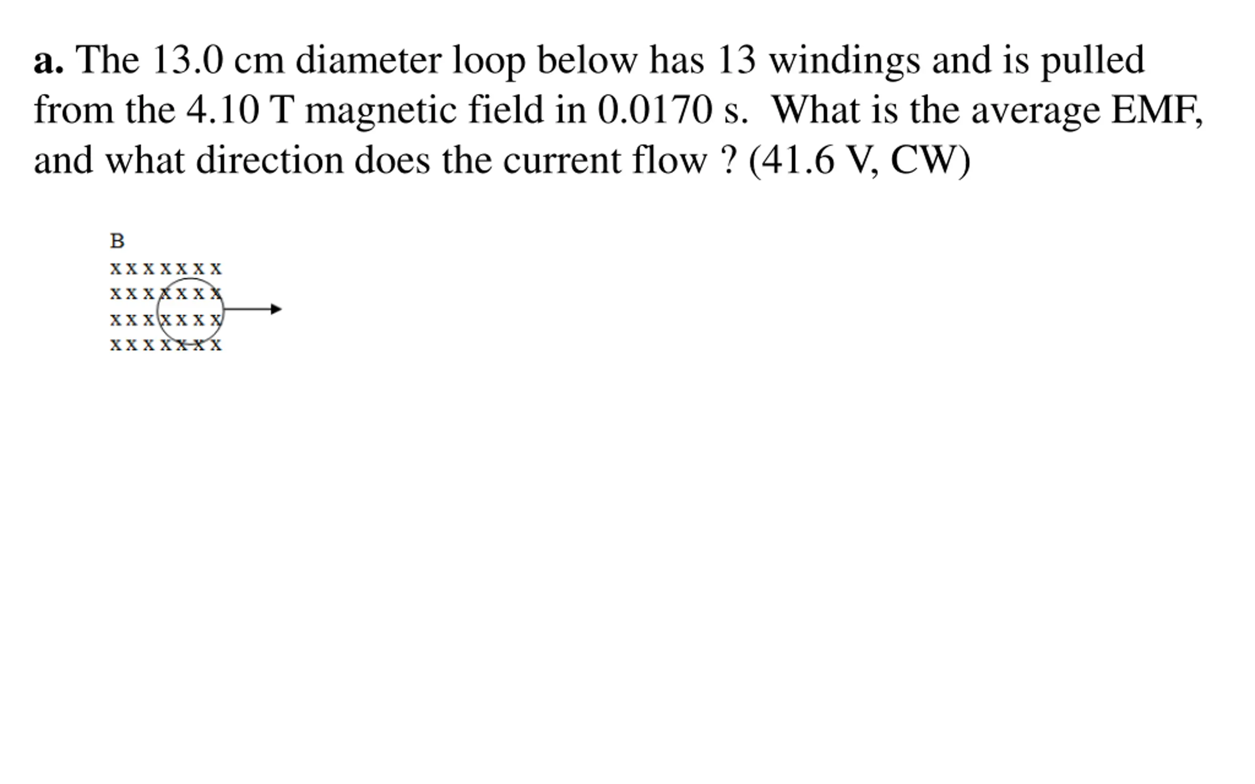 a. The 13.0 cm diameter loop below has 13 windings and is pulled from the 4.10 T magnetic field in 0.0170 s. What is the average EMF, and what direction does the current flow ? (41.6 V, CW)