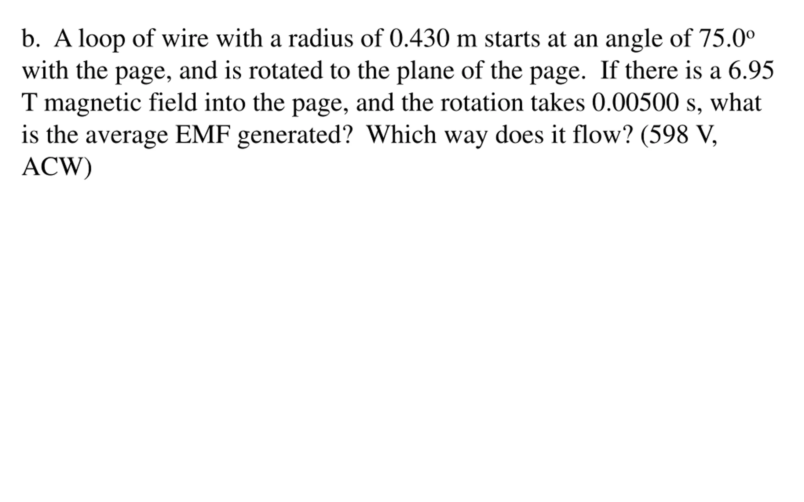 b. A loop of wire with a radius of 0.430 m starts at an angle of 75.0o with the page, and is rotated to the plane of the page. If there is a 6.95 T magnetic field into the page, and the rotation takes 0.00500 s, what is the average EMF generated? Which way does it flow? (598 V, ACW)