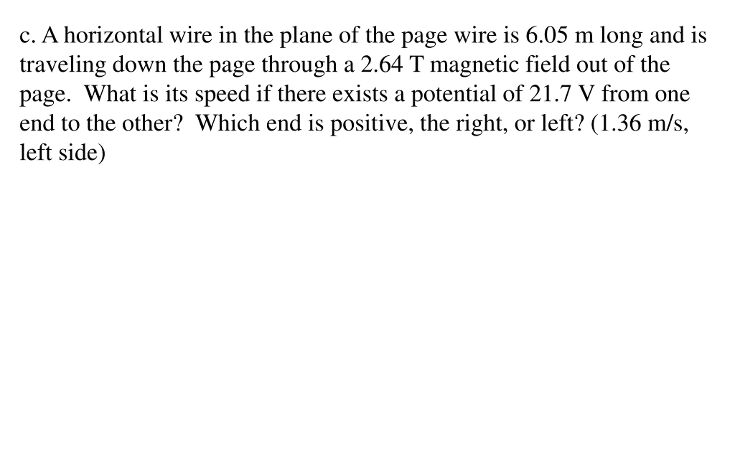c. A horizontal wire in the plane of the page wire is 6.05 m long and is traveling down the page through a 2.64 T magnetic field out of the page. What is its speed if there exists a potential of 21.7 V from one end to the other? Which end is positive, the right, or left? (1.36 m/s, left side)