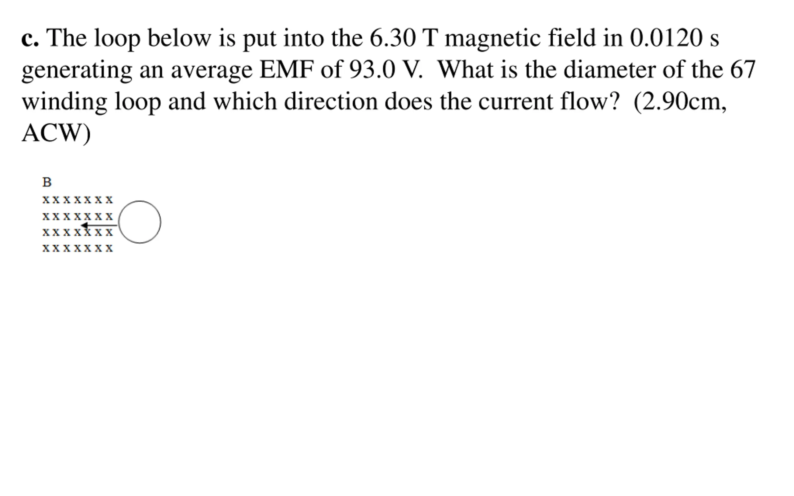 c. The loop below is put into the 6.30 T magnetic field in 0.0120 s generating an average EMF of 93.0 V. What is the diameter of the 67 winding loop and which direction does the current flow? (2.90cm, ACW)