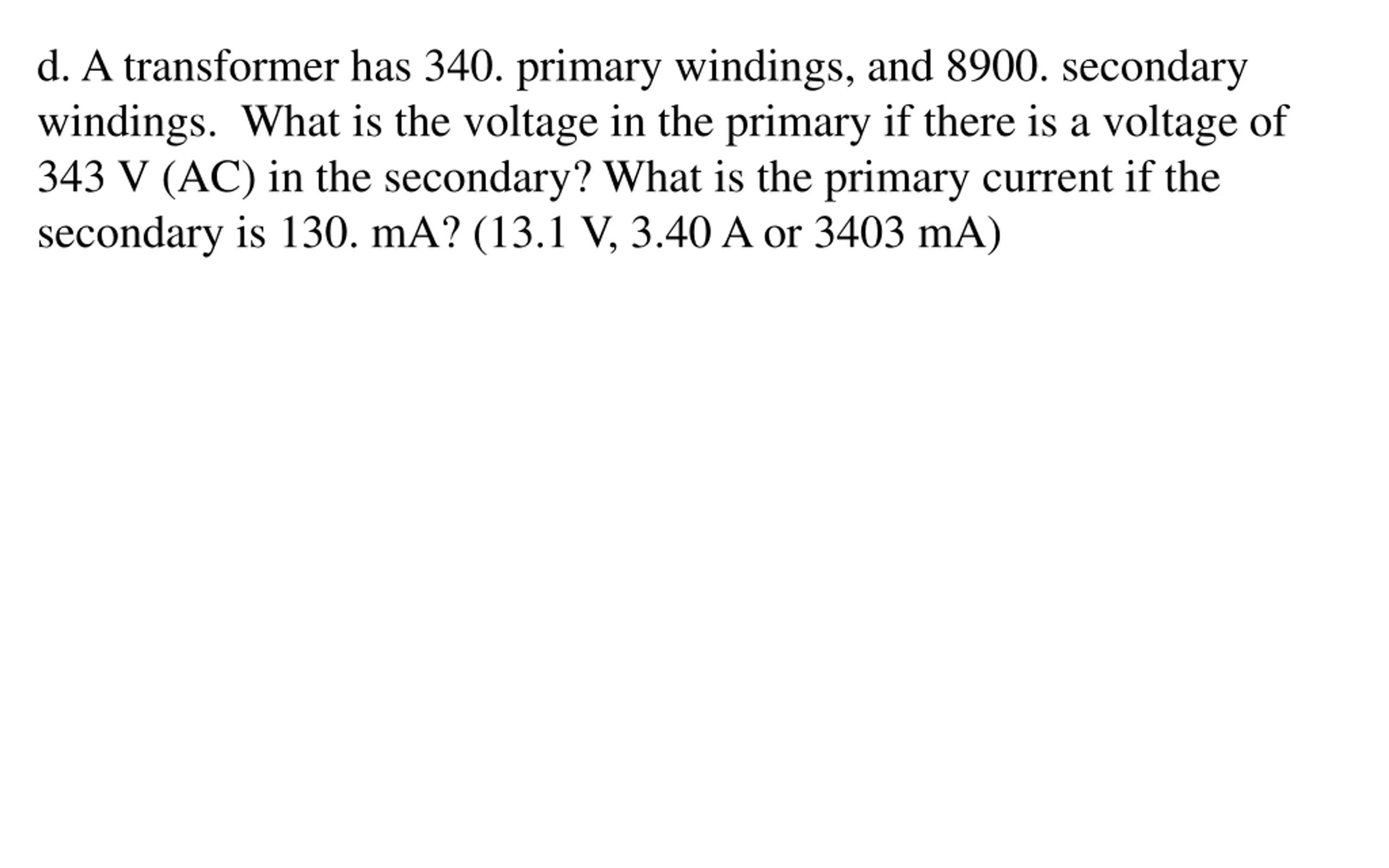 d. A transformer has 340. primary windings, and 8900. secondary windings. What is the voltage in the primary if there is a voltage of 343 V (AC) in the secondary? What is the primary current if the secondary is 130. mA? (13.1 V, 3.40 A or 3403 mA)