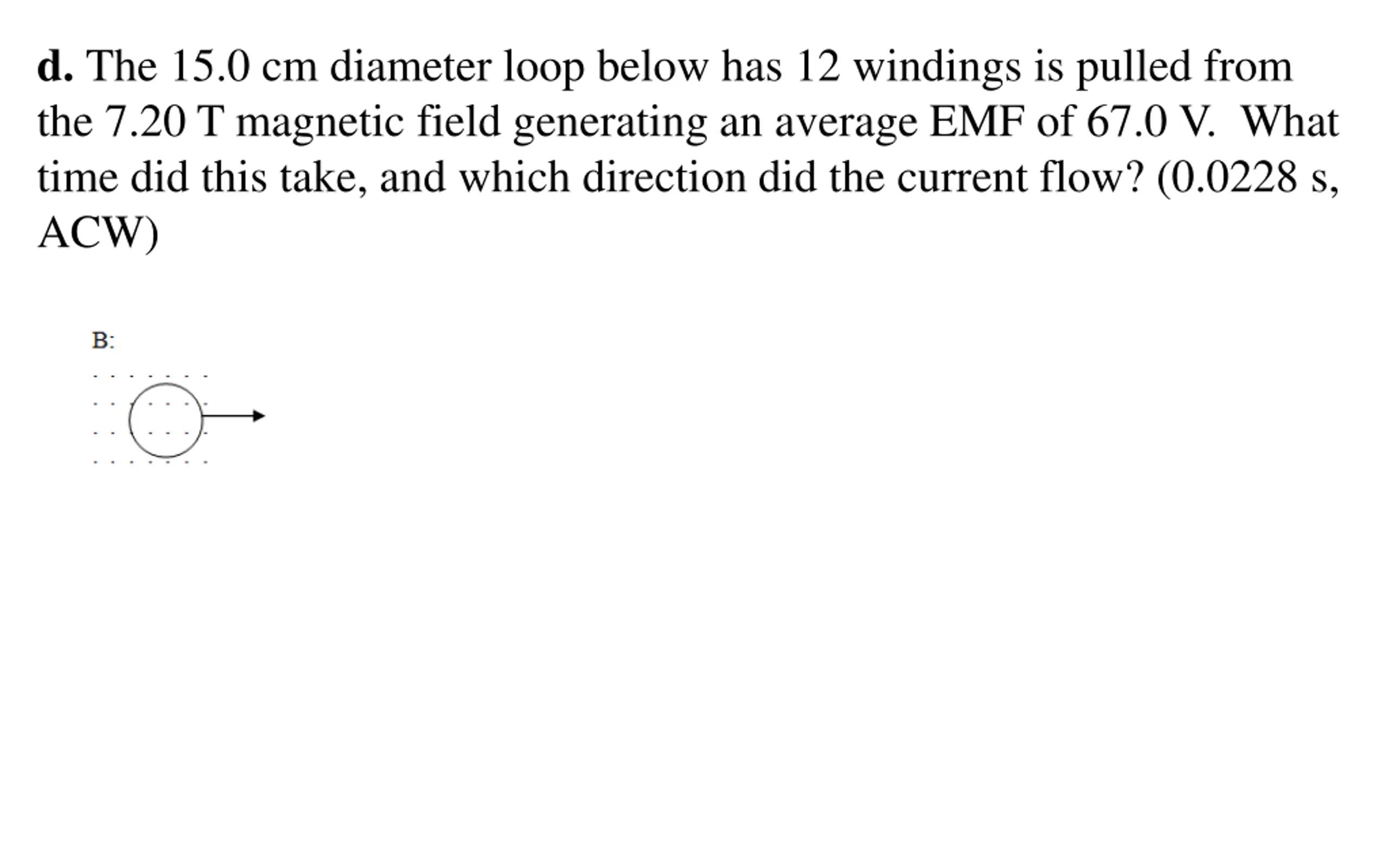 d. The 15.0 cm diameter loop below has 12 windings is pulled from the 7.20 T magnetic field generating an average EMF of 67.0 V. What time did this take, and which direction did the current flow? (0.0228 s, ACW)