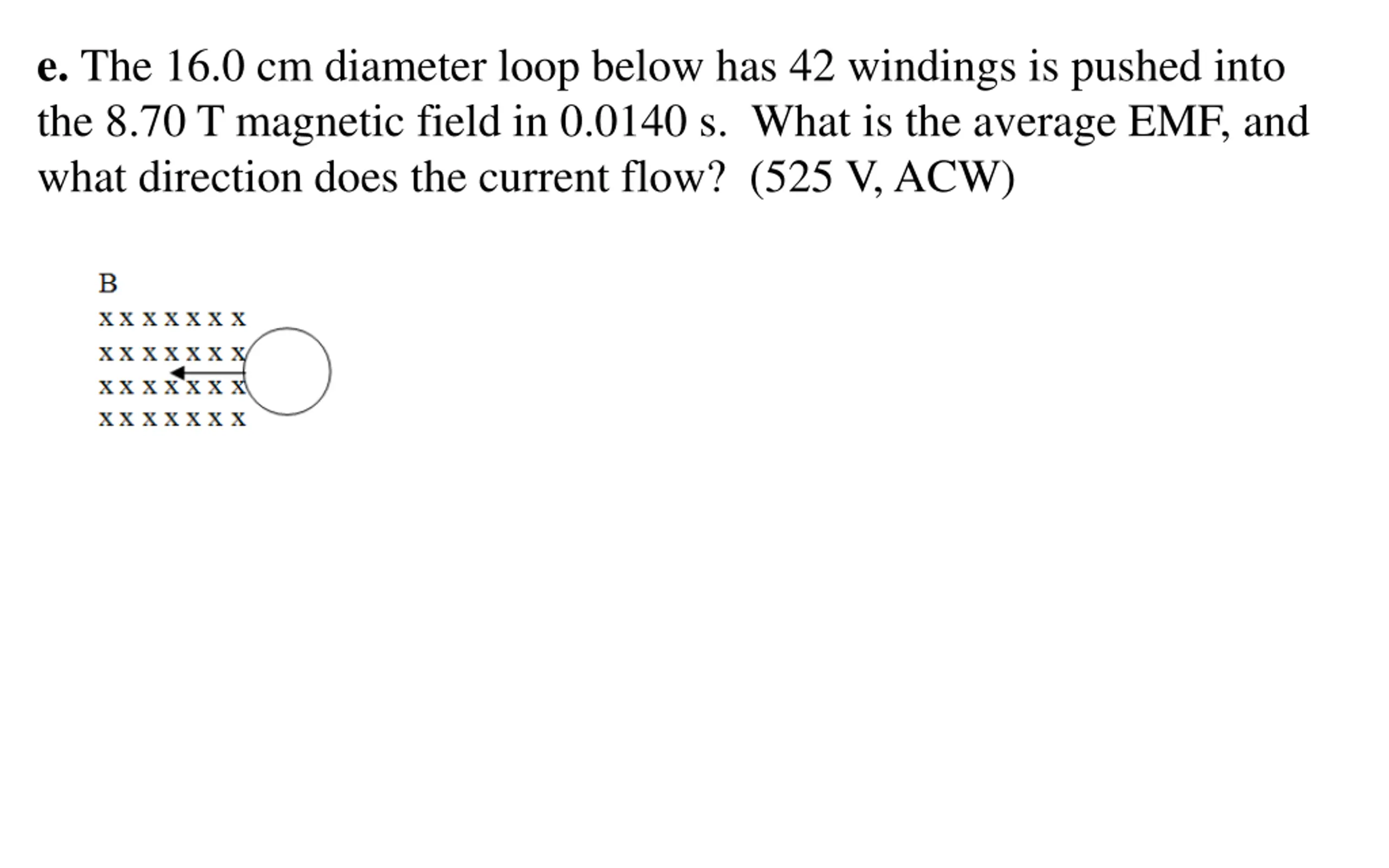 e. The 16.0 cm diameter loop below has 42 windings is pushed into the 8.70 T magnetic field in 0.0140 s. What is the average EMF, and what direction does the current flow? (525 V, ACW)