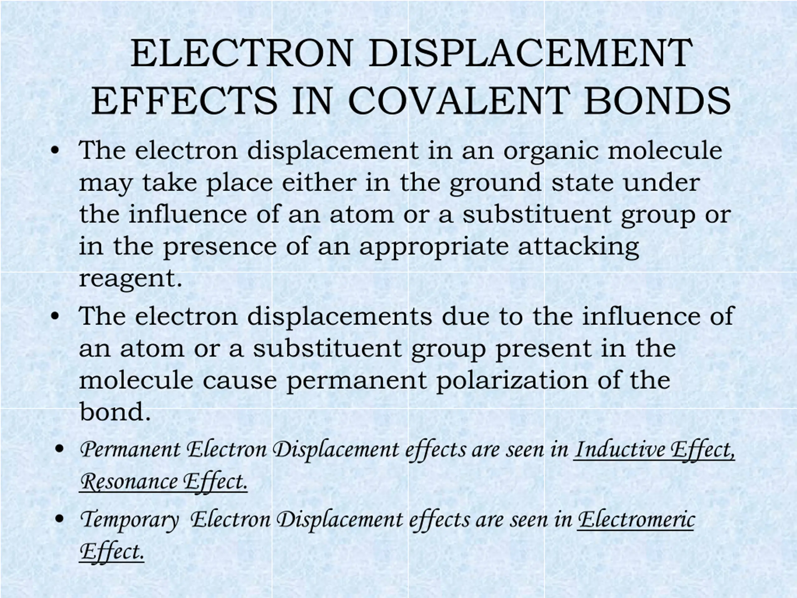 ELECTRON DISPLACEMENT EFFECTS IN COVALENT BONDS The electron displacement in an organic molecule may take place either in the ground state under the influence of an atom or a substituent group or in the presence of an appropriate attacking reagent. The electron displacements due to the influence of an atom or a substituent group present in the molecule cause permanent polarization of the bond. Permanent Electron Displacement effects are seen in Inductive Effect, Resonance Effect. Temporary Electron Displacement effects are seen in Electromeric Effect.