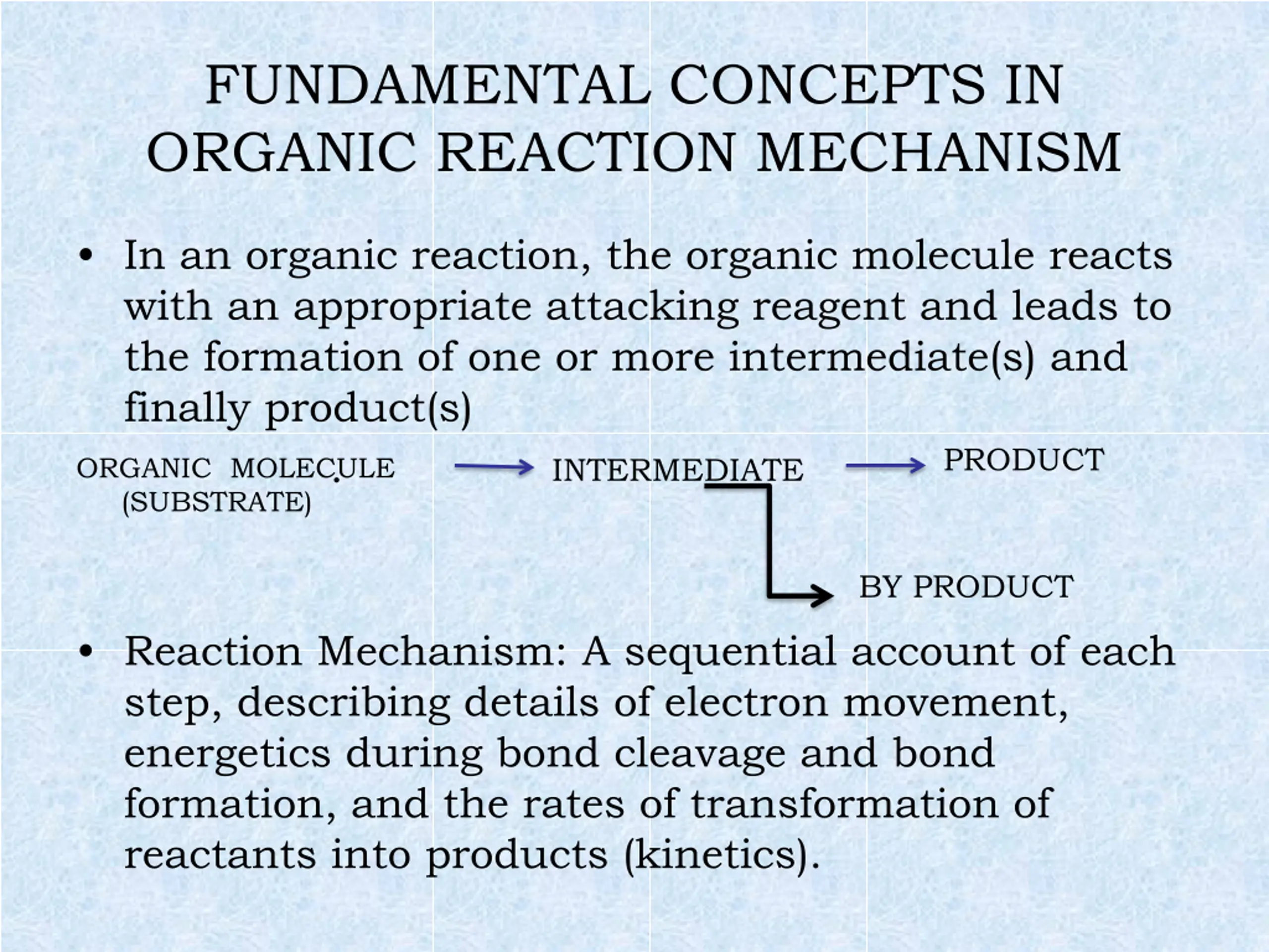 FUNDAMENTAL CONCEPTS IN ORGANIC REACTION MECHANISM In an organic reaction, the organic molecule reacts with an appropriate attacking reagent and leads to the formation of one or more intermediate(s) and finally product(s) . ORGANIC MOLECULE (SUBSTRATE) PRODUCT INTERMEDIATE BY PRODUCT Reaction Mechanism: A sequential account of each step, describing details of electron movement, energetics during bond cleavage and bond formation, and the rates of transformation of reactants into products (kinetics).
