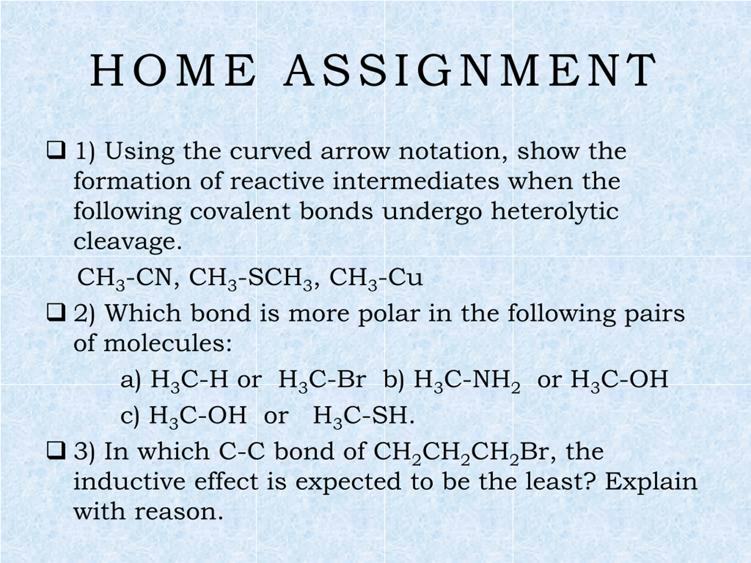 HOME ASSIGNMENT 1) Using the curved arrow notation, show the formation of reactive intermediates when the following covalent bonds undergo heterolytic cleavage. CH3-CN, CH3-SCH3, CH3-Cu 2) Which bond is more polar in the following pairs of molecules: a) H3C-H or H3C-Br b) H3C-NH2 or H3C-OH c) H3C-OH or H3C-SH. 3) In which C-C bond of CH2CH2CH2Br, the inductive effect is expected to be the least? Explain with reason.