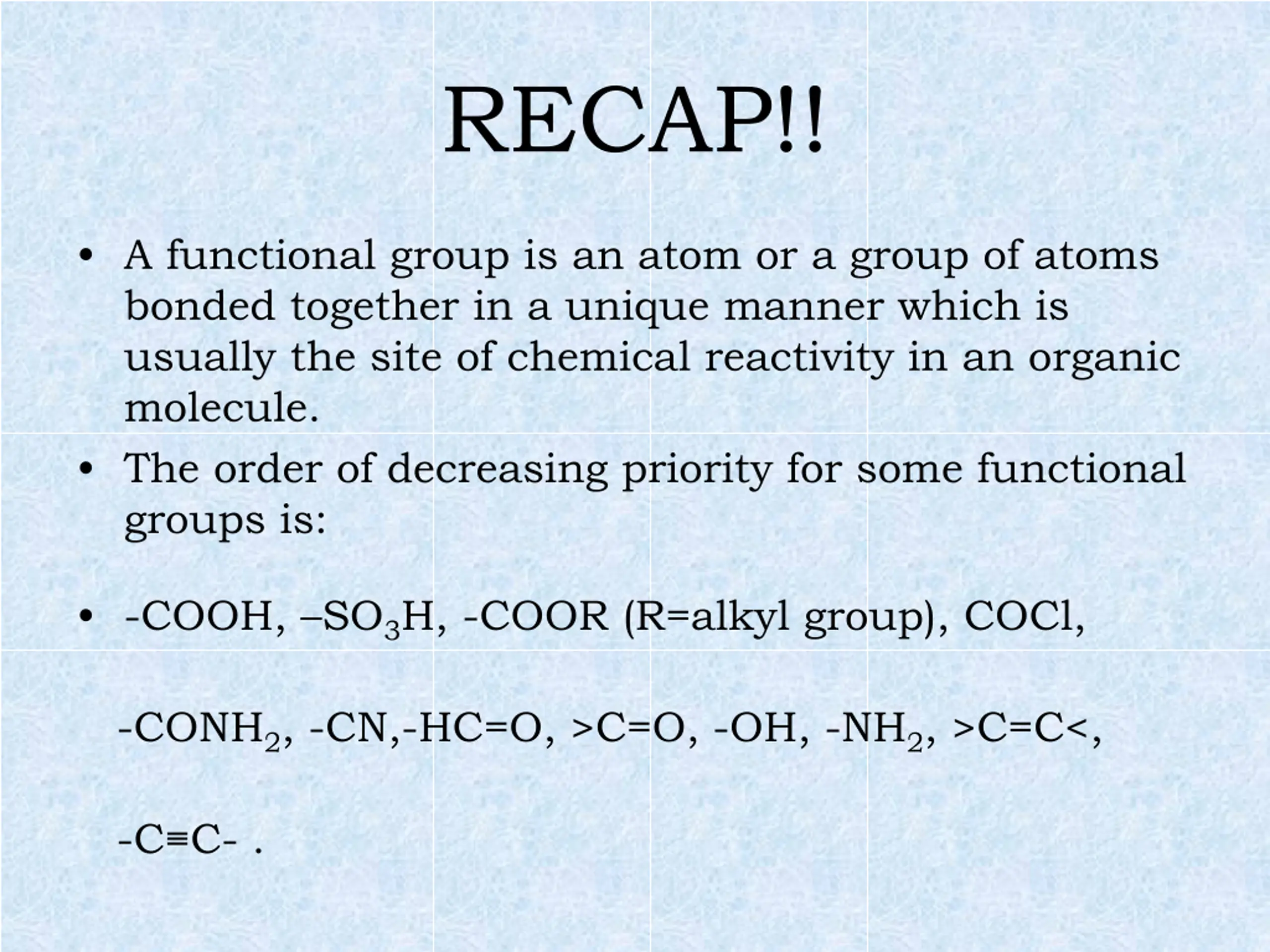 RECAP!! A functional group is an atom or a group of atoms bonded together in a unique manner which is usually the site of chemical reactivity in an organic molecule. The order of decreasing priority for some functional groups is: -COOH, SO3H, -COOR (R=alkyl group), COCl, -CONH2, -CN,-HC=O, >C=O, -OH, -NH2, >C=C<, -C C- .