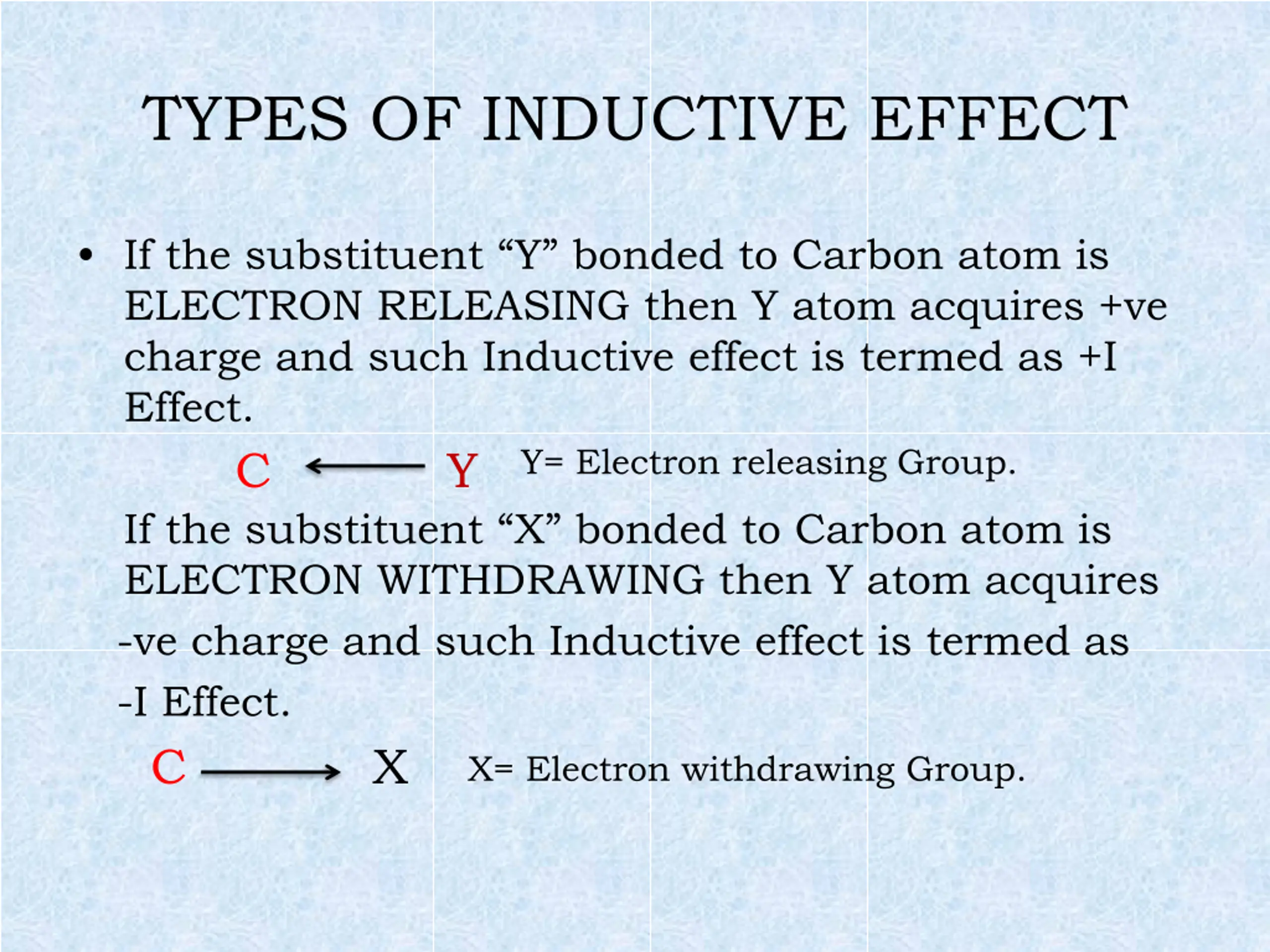 TYPES OF INDUCTIVE EFFECT If the substituent Y bonded to Carbon atom is ELECTRON RELEASING then Y atom acquires +ve charge and such Inductive effect is termed as +I Effect. If the substituent X bonded to Carbon atom is ELECTRON WITHDRAWING then Y atom acquires -ve charge and such Inductive effect is termed as -I Effect. C X X= Electron withdrawing Group. Y= Electron releasing Group. C Y